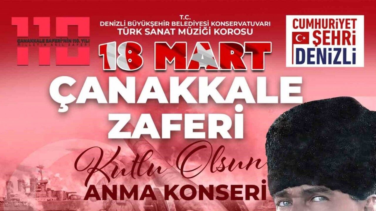 Denizli Büyükşehir Belediyesi, Çanakkale Zaferi’nin 110. yıl dönümünü anlamlı bir etkinlikle kutlamaya hazırlanıyor. Denizli Büyükşehir Belediyesi Konservatuvarı Türk Sanat Müziği Korosu tarafından düzenlenecek olan "18 Mart Çanakkale Zaferi Anma Konseri" vatandaşlarla buluşacak. Çanakkale Zaferi’nin destansı mücadelesinin Türk Sanat Müziği ile birleşeceği konser Şef Ahmet Nuri Çağdaş yönetiminde sahnelenecek.