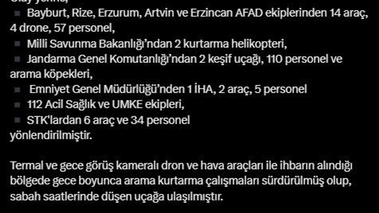 AFAD’ın sosyal medya hesabından yapılan paylaşımda, Eskişehir’den havalanarak Rize’ye giden uçağın saat 18.18’de Erzurum-Rize arasında düştüğü bilgisinin alındığı belirtilerek, "Olay yerine Bayburt, Rize ve Erzurum AFAD ekiplerinden 14 araç, 4 dron, 57 personel, Milli Savunma Bakanlığı’ndan 2 kurtarma helikopteri, Jandarma Genel Komutanlığı’ndan 2 keşif uçağı, 110 personel ve arama köpekleri, Emniyet Genel Müdürlüğü’nden 1 İHA, 2 araç, 5 personel, 112 Sağlık ve UMKE ekipleri, STK’lardan 6 araç ve 34 personel yönlendirilmiştir" ifadelerine yer verildi.