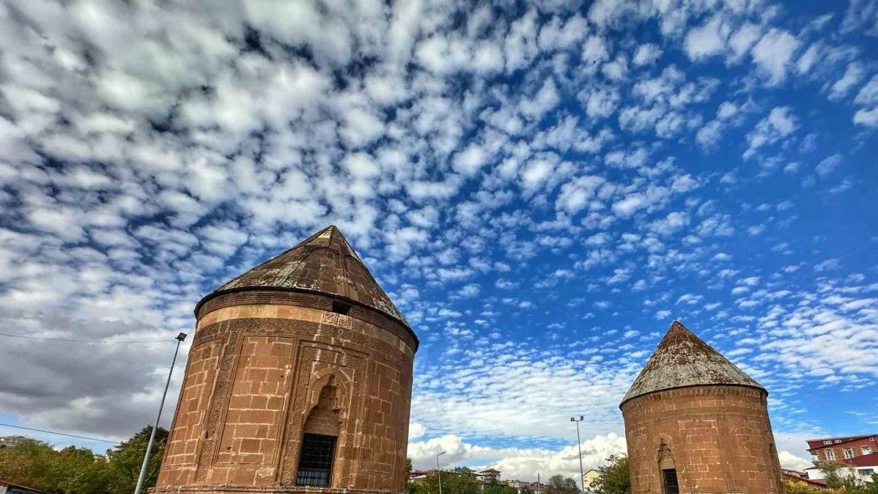 Bitlis’in Ahlat ilçesinde gökyüzünde oluşan yoğun bulut kümeleri, tarihi kümbetlerle birleşince ortaya seyri güzel manzaralar çıktı.