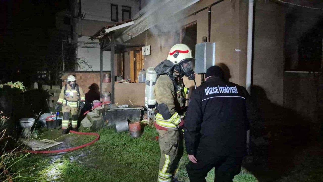 Düzce’de gece saatlerinde Çay Mahallesi Alev Sokak’ta bulunan İbrahim Keskinoğlu’na ait evde bilinmeyen nedenle yangın çıktı. Evin depo olarak kullanılan bodrumunda başlayan yangında alevler kısa sürede evi sardı. Evden çıkan dumanları gören mahalle sakinlerinin 112 Acil Çağrı Merkezi’ne haber vermesi üzerine olay yerine itfaiye, polis ve sağlık ekipleri sevk edildi. İtfaiye ekiplerinin alevlere müdahale etmesiyle alevler kısa sürede söndürülürken, evin içinde büyük çapta maddi hasar oluştu.