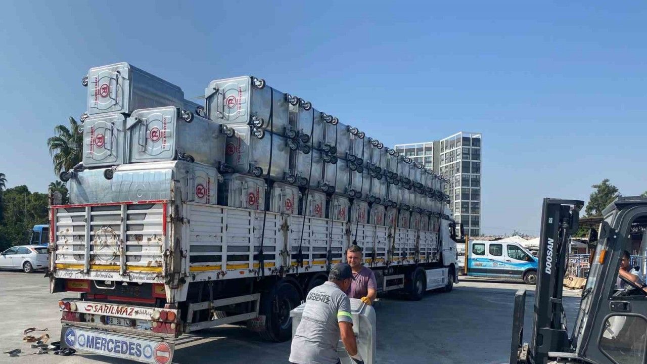 Kent merkezinde yer alan Akdeniz Belediyesi, gündüz nüfusunun 700 bini aşması nedeniyle artan hareketliliğe karşılık, belediye bütçesini vatandaşların yararına en verimli şekilde kullanmayı sürdürüyor. Yetersiz çöp konteyneri sorununu ortadan kaldırmayı amaçlayan belediye, yeni alınan konteynerleri tırlarla müdürlük yerleşkesine getirerek forklift yardımıyla sahaya indirdi.