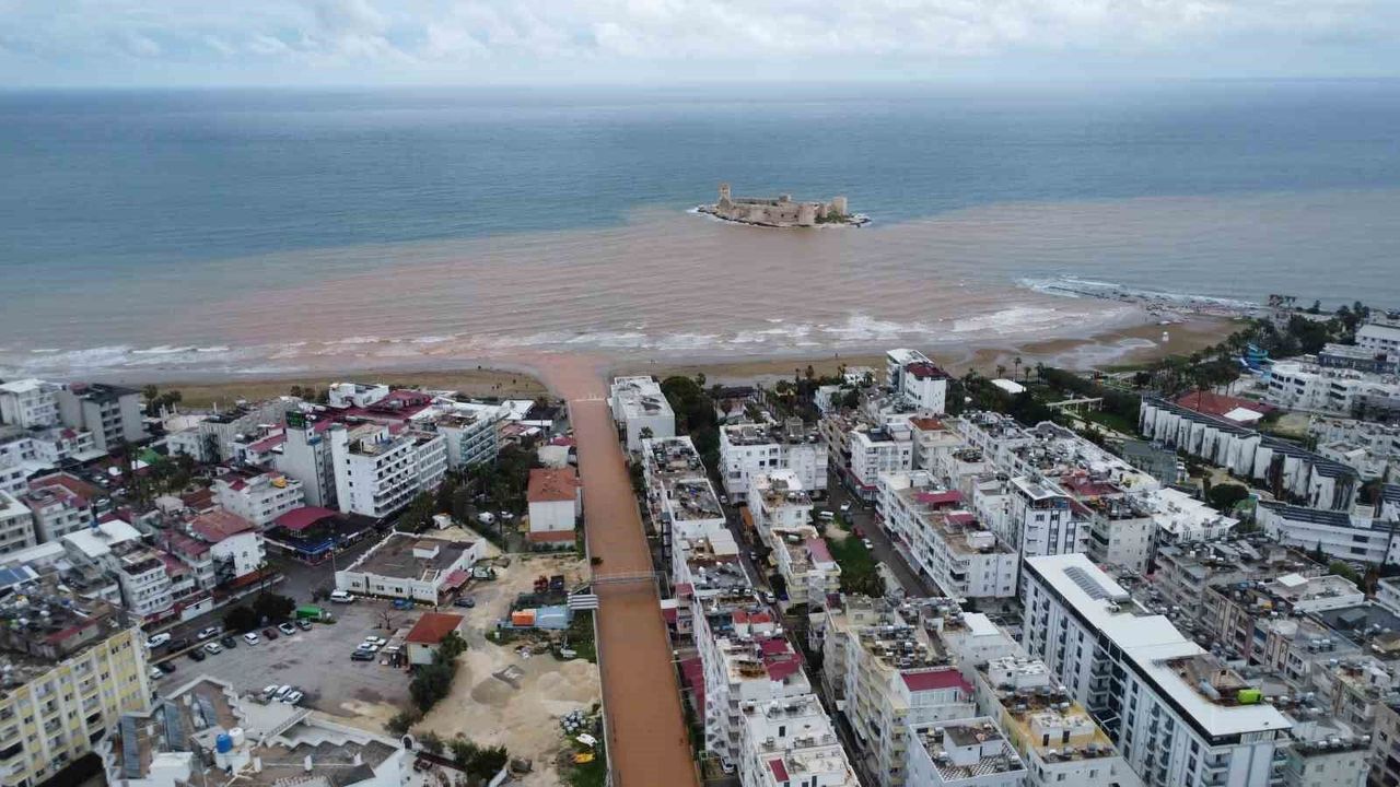 Mersin'de 3 gündür devam eden yağışlar etkisini sürdürürken derelere akan sel suları turizm merkezi Kızkalesi'ni hem çamura hem de kahverengiye bürüdü.