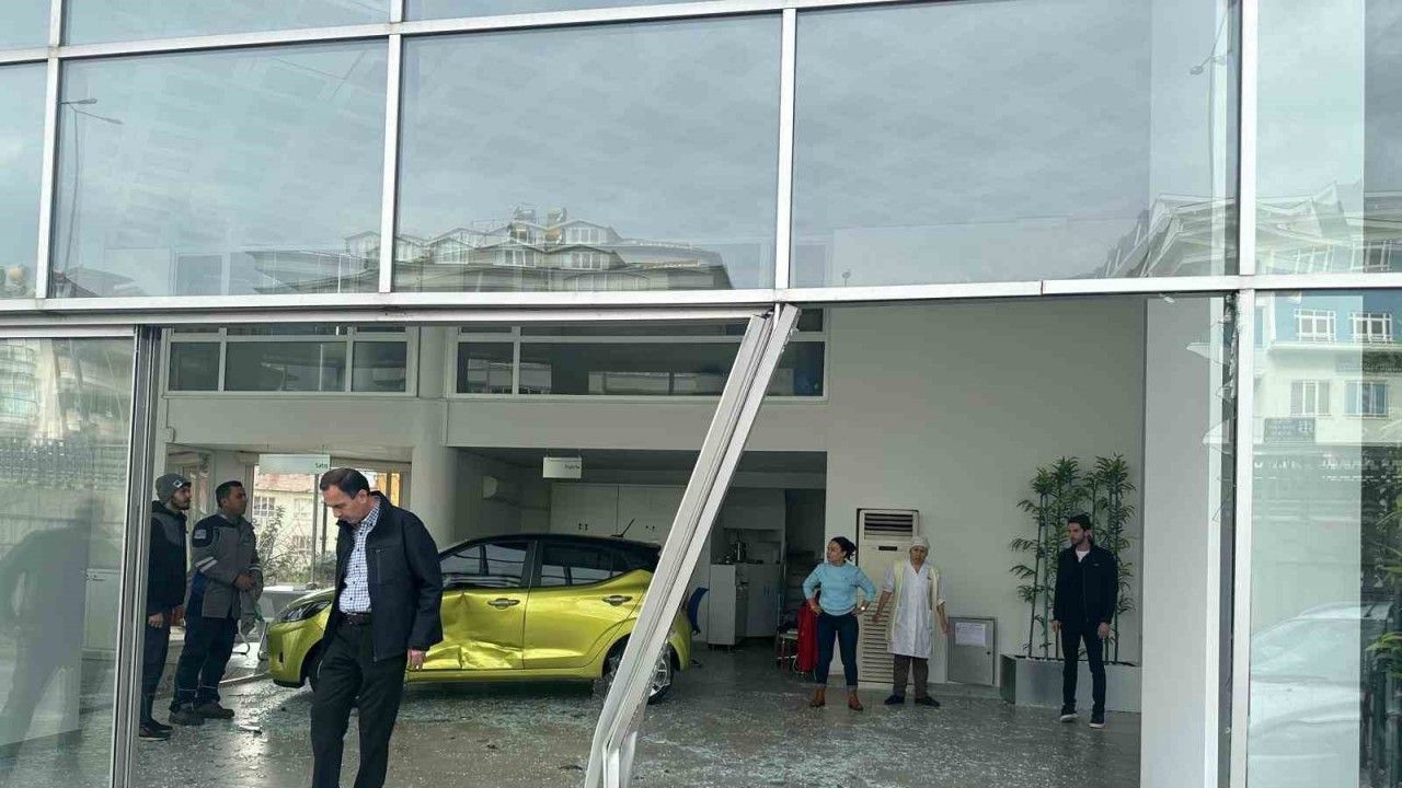 Antalya’nın Alanya ilçesinde şerit ihlali yaptıktan sonra direksiyon hakimiyetini kaybeden sürücü, otomobil satışı yapan mağazaya girdi.