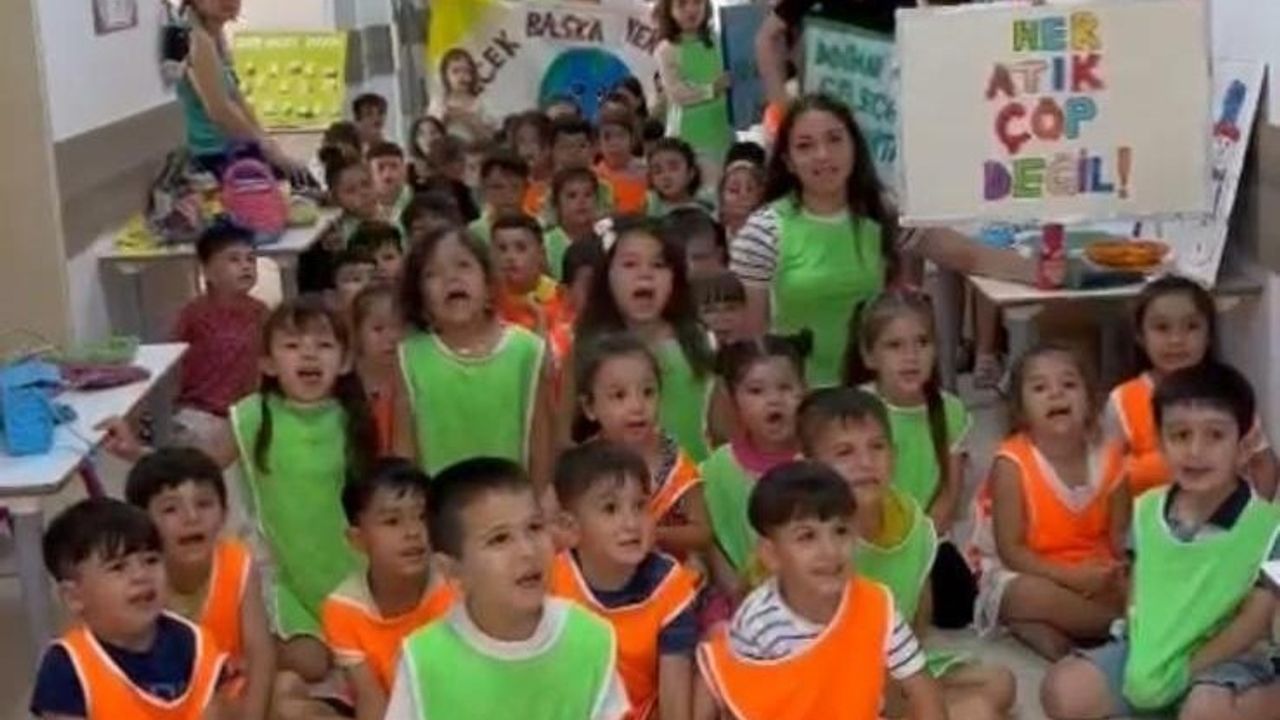 Öğrenciler, öğretmenleriyle birlikte okul bahçesinde ellerinde çevre temalı dövizlerle oturarak doğa sevgisi ve çevre koruma konusunda farkındalık oluşturdu. Etkinlik kapsamında çocuklara küçük yaşta çevre bilinci kazandırılması hedeflendi.