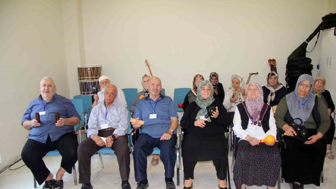 Merkezdeki müzik kursuna katılan alzaymır ve demans hastası yaşlılar, şarkılar eşliğinde darbuka gibi müzik aletlerini çalıp hoş vakit geçiriyor.