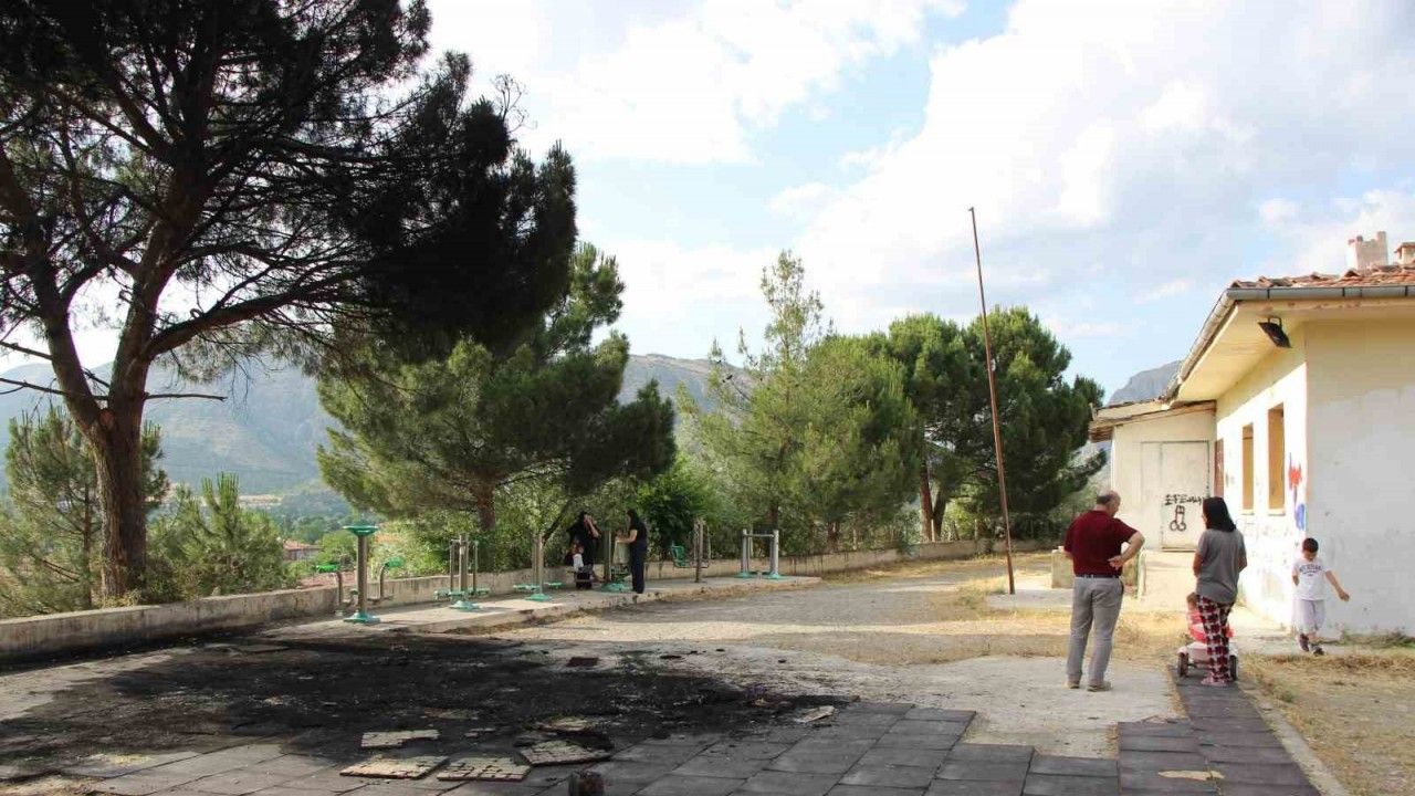 Amasya’da bir çocuk parkı alev alev yandı. Çocuklar ve muhtar bölgedeki tek çocuk parkının tekrar kurulmasını istedi.