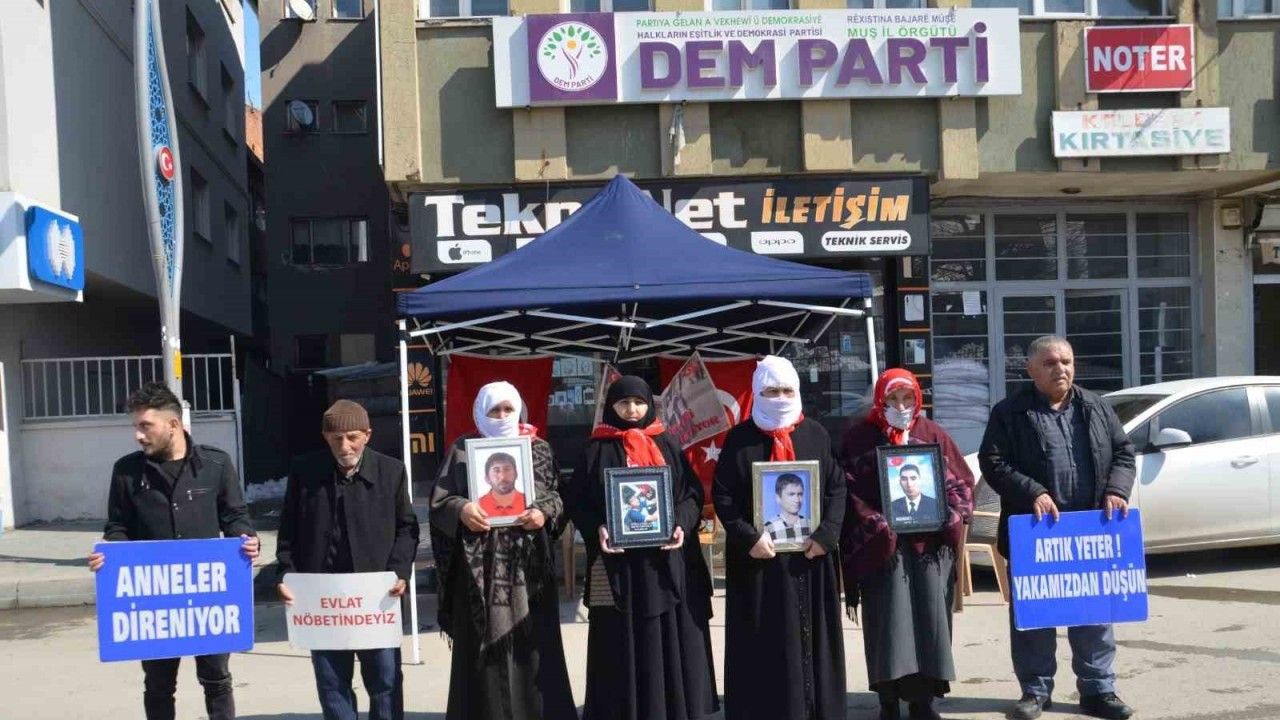 Muş’ta çocukları terör örgütü PKK tarafından kaçırılan aileler, DEM Parti İl Başkanlığı önündeki eylemlerine devam ediyor.