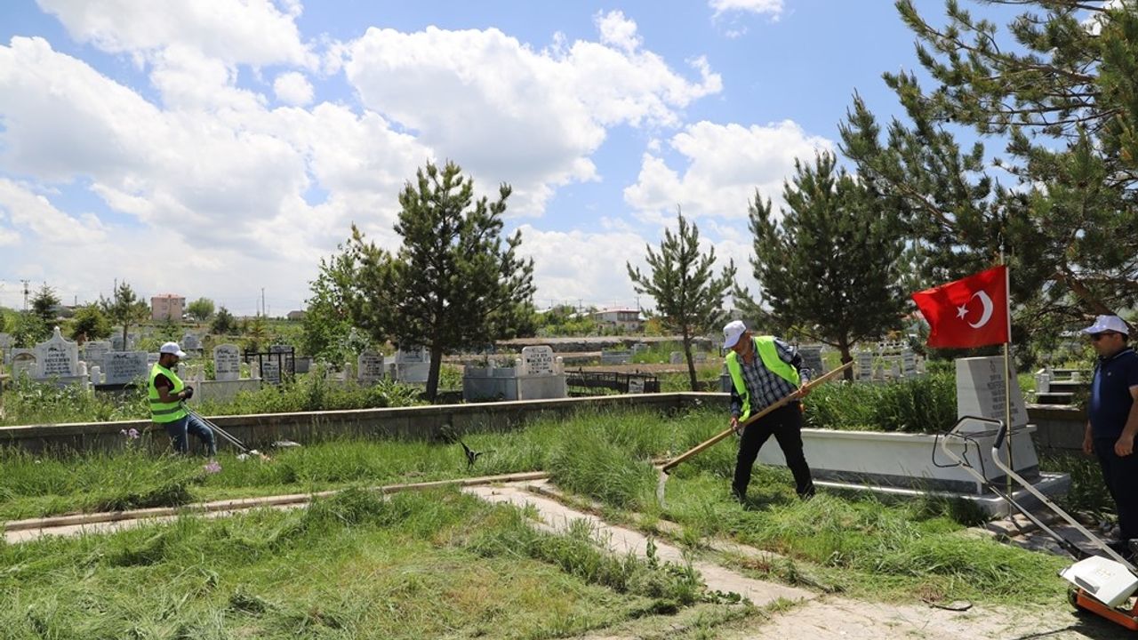 Ekipler, vatandaşların bayramda rahat bir şekilde mezarlıkları ve şehitliği ziyaret edebilmeleri için uzamış olan otları hem iş makineleri hem de tırpan yardımıyla biçerek kötü görüntülerin önüne geçiyor.