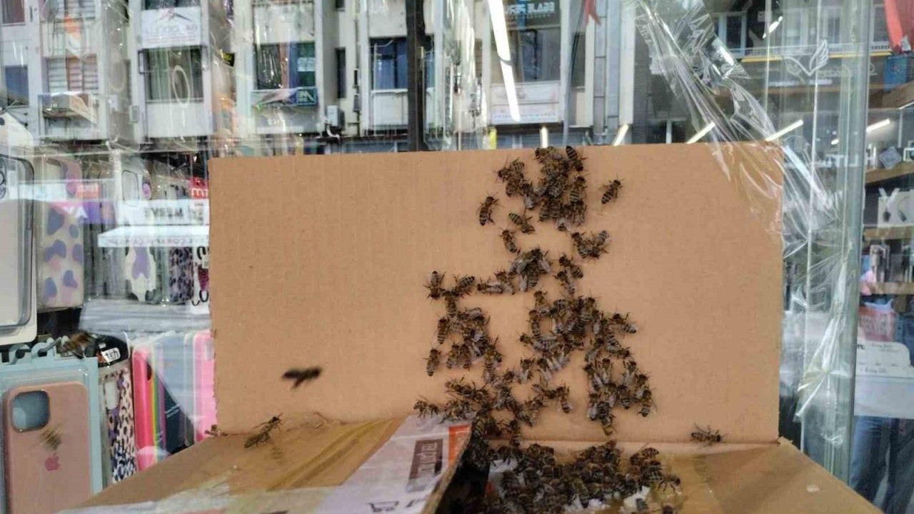 Arıları kutu içerisine toparlamaya çalışan Turgut Erturunç, "Sabah dükkanı açmaya geldiğim zaman dükkanın tabelasına yığılmışlardı. Yoldan geçen birisi gelmiş arıların yarısını almış yarısı kalmış. Kraliçe arıyı almamış. Belediyenin ekipleri geldi arıları zehirlemek istediler. Arıların zehirlenmesine izin vermedik. Kutu getirdik Kraliçe arıyı kutu içerisine aldık. Yavaş yavaş tüm arıları kutu içerisine alacağız" dedi.