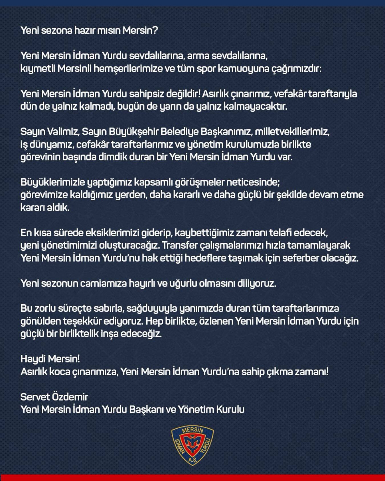 Taraftarların desteğine özel olarak teşekkür eden Özdemir, “Sabırla ve sağduyuyla yanımızda duran tüm taraftarlarımıza minnettarız. Hep birlikte, özlenen Yeni Mersin İdman Yurdu’nu yeniden inşa edeceğiz” açıklamasında bulundu.