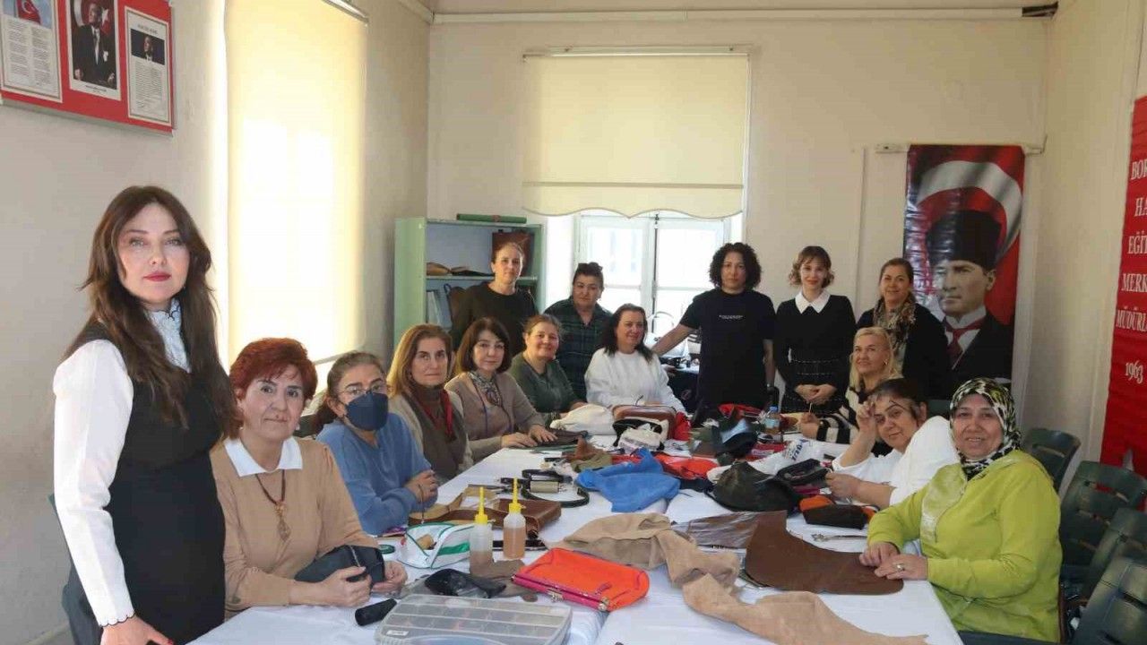 Kurs yerinde daha çok kadınların kullanabileceği ya da çevrelerine hediye edebilecekleri ürünlerin üretildiğine değinen Büyükhatipoğlu, derilerin; çanta, cüzdan, takı ve giysiye dönüştürüldüğünü kaydetti.