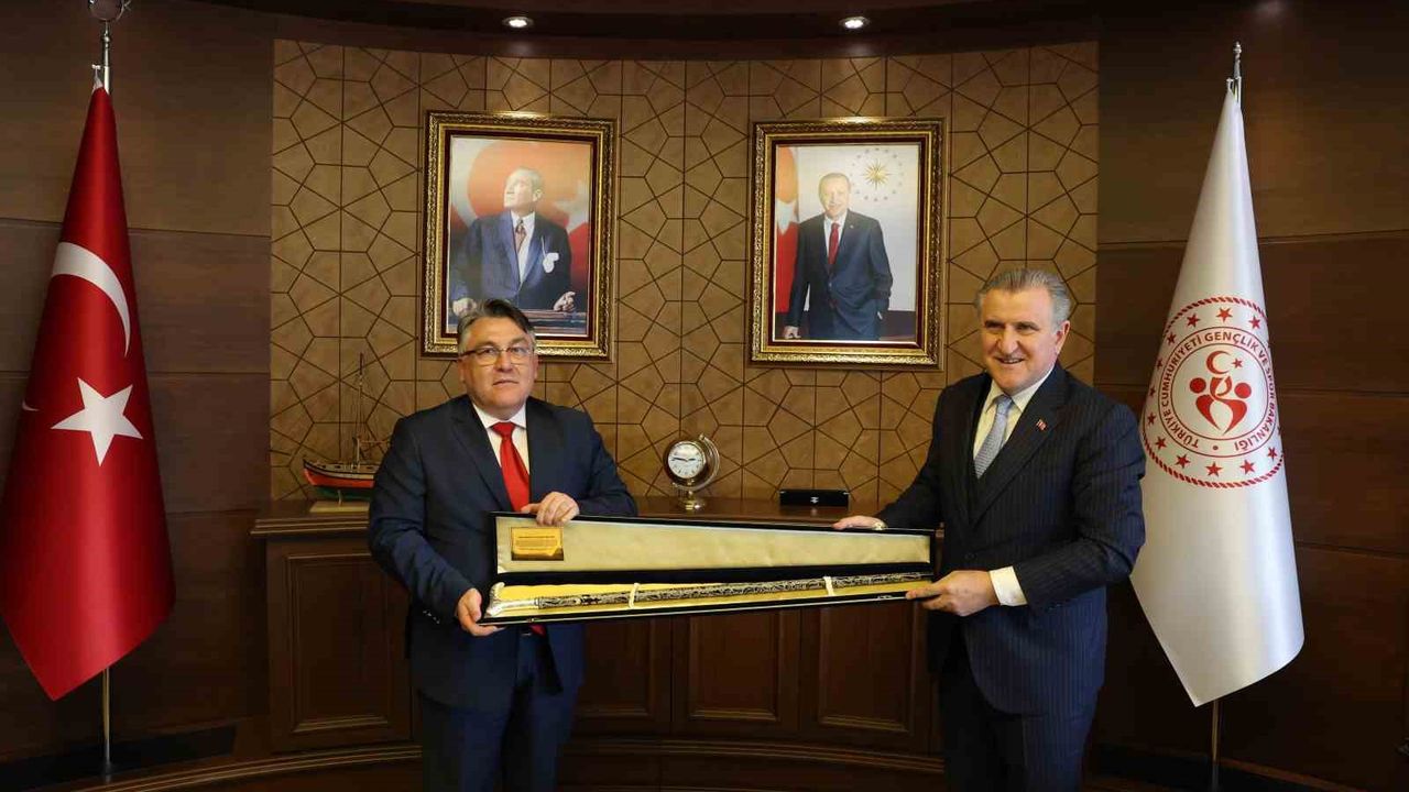 Gençlik ve Spor Bakanlığında gerçekleşen kabulde; Gençlik ve Spor Bakanı Dr. Osman Aşkın Bak, Zonguldak Bülent Ecevit Üniversitesi Rektörü Prof. Dr. İsmail Hakkı Özölçer, Rektör Yardımcısı Prof. Dr. Servet Karasu ve Bakan Danışmanı Prof. Dr. Güler Alkan yer aldı. Bakan Dr. Osman Aşkın Bak, Zonguldak Bülent Ecevit Üniversitesinin spor ve sosyal alanda gerçekleştirdiği faaliyetler ve başarılar hakkında Rektör Özölçer’den bilgi aldı. Rektör Özölçer, BEUN olarak son yıllarda ulusal ve uluslararası çok sayıda şampiyona ve turnuvada BEUN öğrencilerinin elde ettikleri üstün başarılar hakkında Bakan Dr. Osman Aşkın Bak’a bilgilendirmelerde bulundu. Akademik, kültürel ve toplumsal çıktıları giderek artan bir performansla çalışmalar gerçekleştirdiklerini sözlerine ekleyen Rektör Özölçer, sportif faaliyetlerde de BEUN’un giderek ulusal ve uluslararası camiada adından sıklıkla söz ettirdiğini, bunda nitelikli öğretim kalitesinin artışı kadar akademik personel ve öğrencilerin özverili, büyük emekle neticelendirilmiş çalışmalarının da etkili olduğunu aktardı. Tüm bu olumlu gelişmelerin, özellikle Gençlik ve Spor Bakanlığı’nın her daim motive edici ve destekleyici yaklaşımı neticesinde başarıyla taçlandığını belirten Rektör Özölçer, nazik misafirperverlikleri ile destekleri ve teşvikleri münasebetiyle Gençlik ve Spor Bakan’ı Dr. Osman Aşkın Bak’a teşekkürlerini sundu.