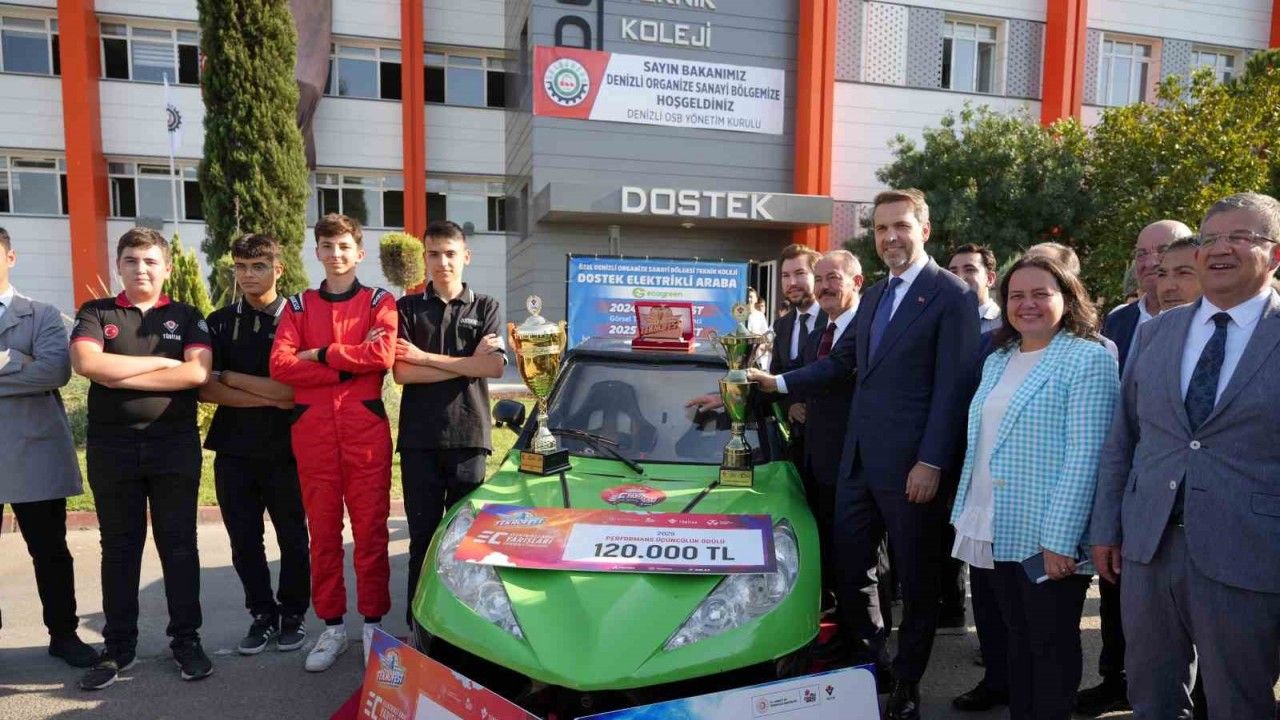 Bir dizi ziyaret kapsamında Denizli’ye gelen Enerji ve Tabii Kaynaklar Bakanı Alparslan Bayraktar, Denizli Organize Sanayi Bölgesi DOSTEK Koleji’ni ziyaret etti. Teknofest 2025’te 4 ana kategoride ödül alan öğrenciler, okula gelen Bakan Bayraktar’ı Ecogreen Enerji’nin destekleriyle ürettikleri elektrikli araç ile karşıladı. Enerji ve Tabii Kaynaklar Bakanı Bayraktar, burada gençlerden araç hakkında bilgi alarak bir süre sohbet etti, kolejin konferans salonunda sanayiciler, öğretmenler ve öğrenciler ile bir araya geldi.