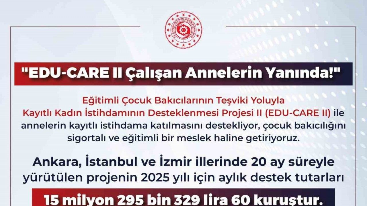 Çalışma ve Sosyal Güvenlik Bakanı Vedat Işıkhan, sosyal medya hesabından yaptığı paylaşımda, “Çalışan annelerin her zaman yanındayız” dedi. Bakan Işıkhan, paylaşımında EDU-CARE II sayesinde annelerin kayıtlı istihdama katılmasını desteklediklerini belirterek, “Sigortalı ve eğitimli çocuk bakıcılığını teşvik ediyoruz. Ankara, İstanbul, İzmir illerinde yürütülen projeye 2025 yılında toplam 15 milyon liradan fazla destek tutarı sağlanacak” ifadelerine yer verdi.