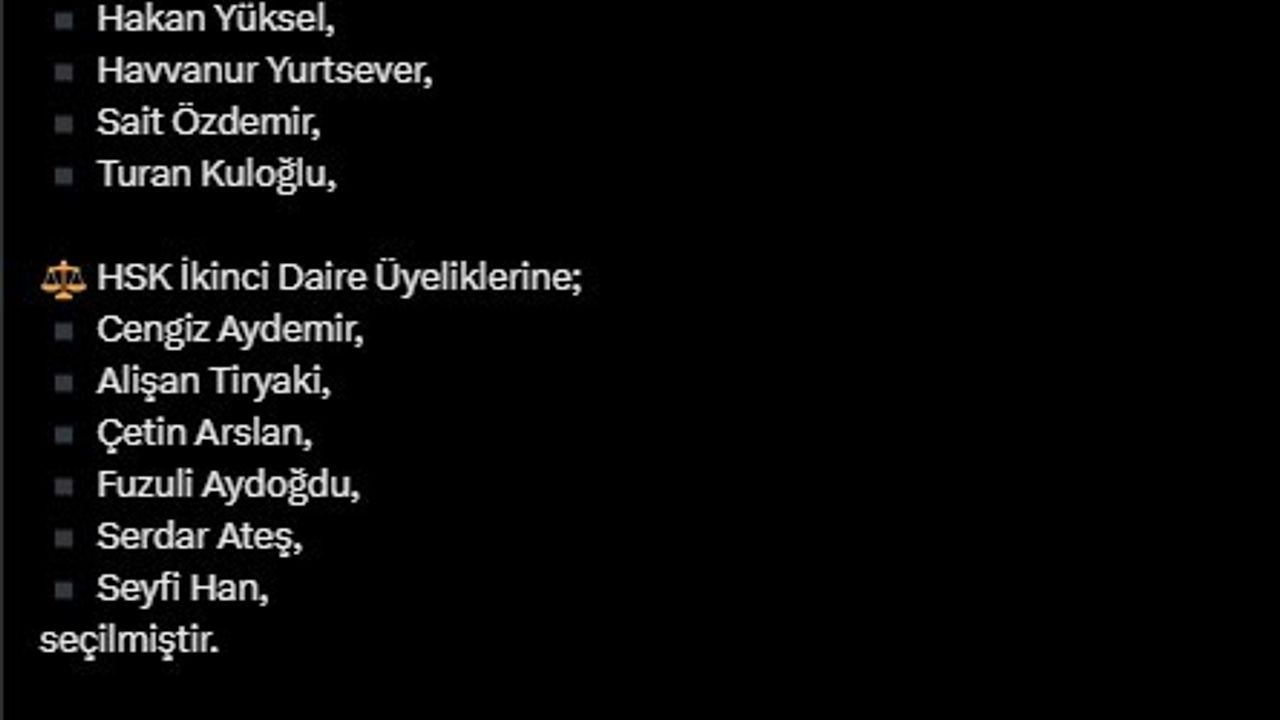 Adalet Bakanı Yılmaz Tunç sosyal medya hesabı ’X’ üzerinden yaptığı paylaşımda Hâkimler ve Savcılar Kurulu (HSK) Genel Kurul toplantısını gerçekleştirdiklerini ifade etti. Genel Kurulda, HSK Birinci Daire Üyeliklerine, Bülent Küfüdür, Hakan Yüksel, Havvanur Yurtsever, Sait Özdemir ile HSK Birinci Daire Başkanlığına Turan Kuloğlu’nun seçildiğini belirten Bakan Tunç, HSK İkinci Daire Üyeliklerine; Cengiz Aydemir, Alişan Tiryaki, Çetin Arslan, Serdar Ateş, Seyfi Han’ın seçildiğini İkinci Daire Başkanlığına ve HSK Başkanvekilliğine ise Fuzuli Aydoğdu’nun seçildiğini ifade etti.