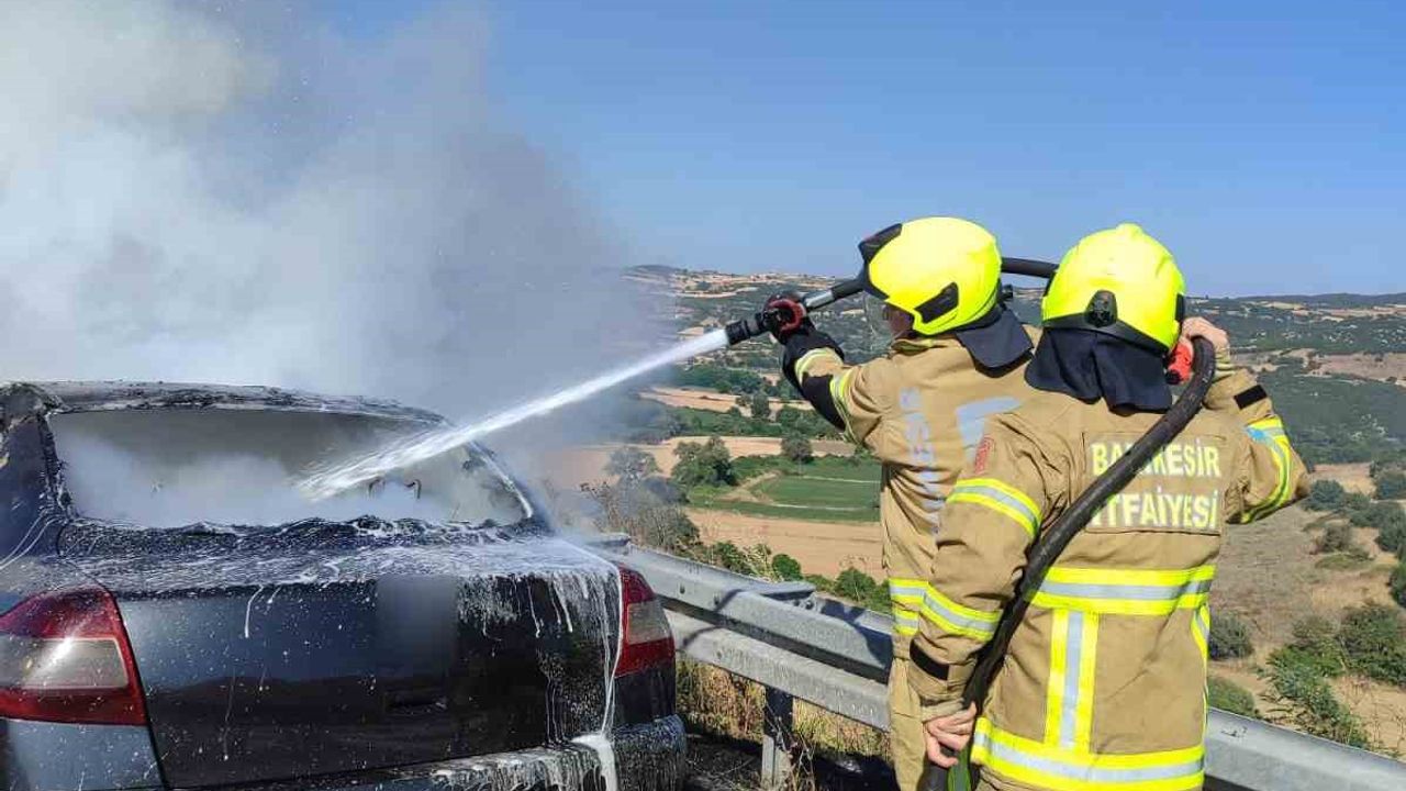 Balıkesir’de İstanbul-İzmir otoyolunda meydana gelen araç yangınında otomobil kullanılmaz hale geldi.