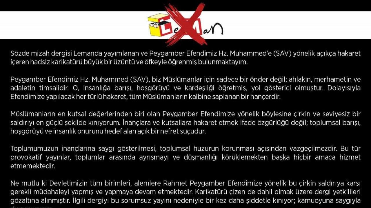 Başkan Çetinkaya, konuyla ilgili yaptığı yazılı açıklamada, söz konusu yayını derin bir üzüntü ve öfkeyle öğrendiğini belirterek, "Peygamber Efendimiz, Müslümanlar için sadece bir önder değil, aynı zamanda ahlakın, merhametin ve adaletin sembolüdür. O’na yapılacak her türlü hakaret, tüm Müslümanların kalbine saplanan bir hançerdir." ifadelerini kullandı.