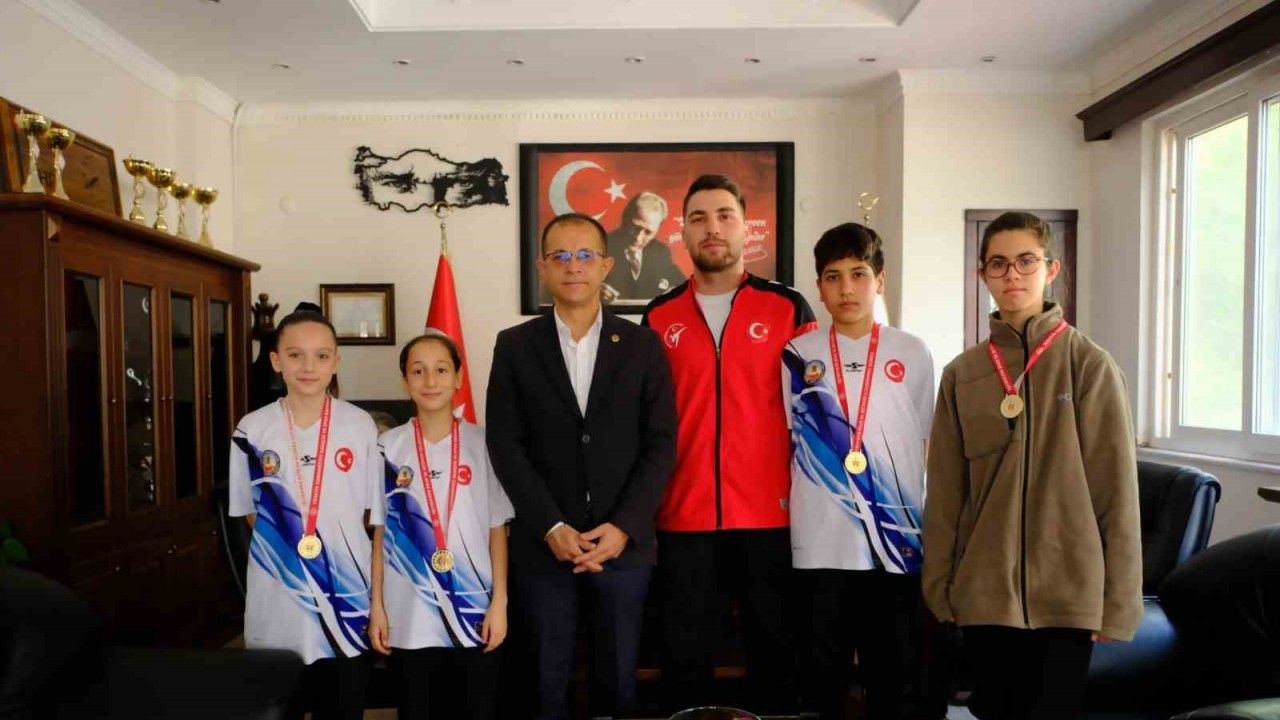 Aydın’da okul sporları maçlarında 4 birincilik kazanan Kuyucak Belediyespor Taekwondo Takımı sporcuları, Takım Antrenörü Denizhan Gezgin Kuyucak Belediye Başkanı Uğur Doğanca’yı makamında ziyaret etti.