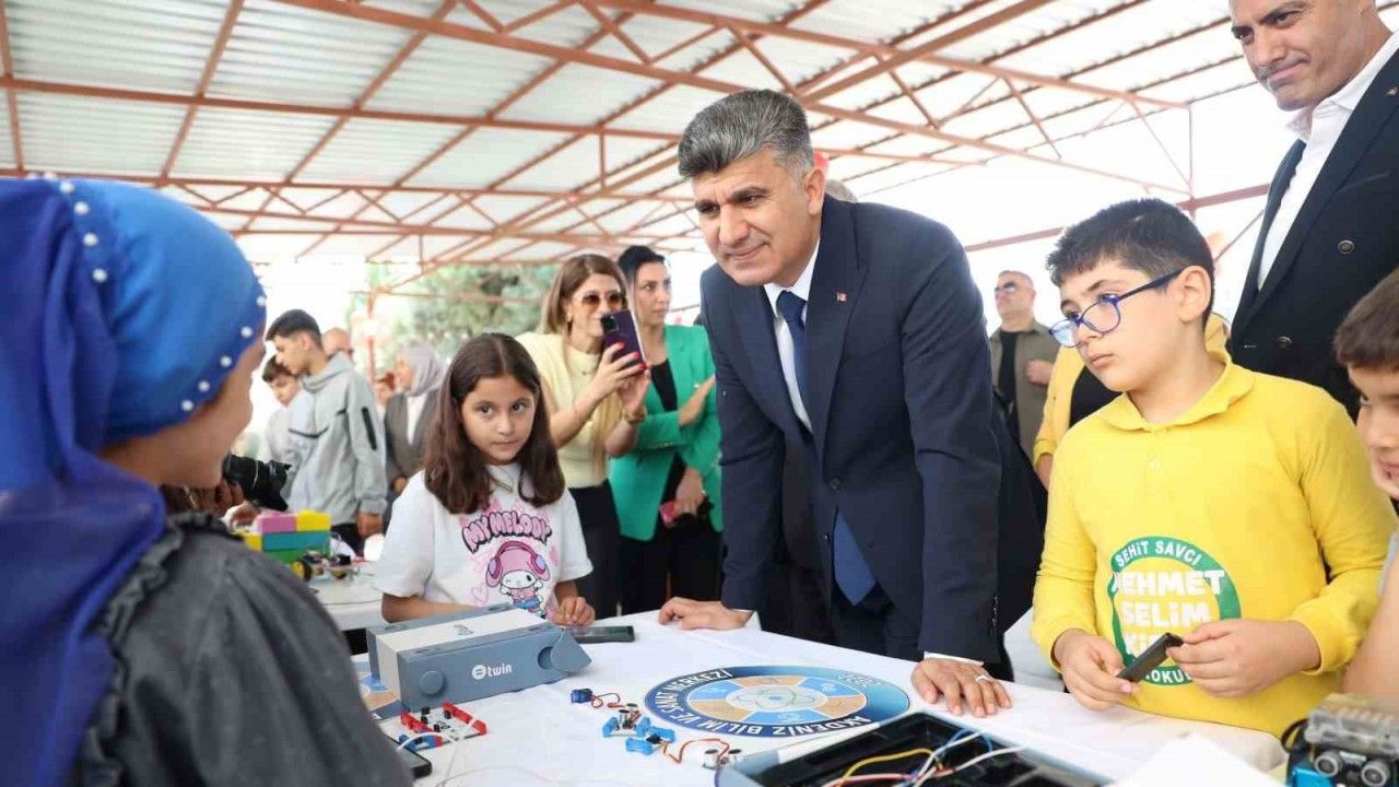 İlçe Milli Eğitim Müdürü Saim Demir ile birlikte stantları gezen Akdeniz Belediyesi Başkan Vekili Şener, öğrencilerden projeleri hakkında bilgi aldı, emekleri için tebrik etti.