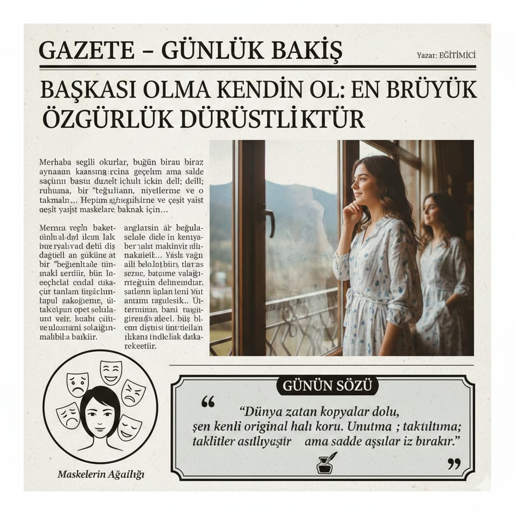 Sevgili dostlar, unutmayın ki bu hayat bir defalık bir sahne. Başkasının rolünü ezberlemekle ömür tüketmeyin. Kendi senaryonuzu yazın, kendi sesinizle konuşun. Göreceksiniz ki siz kendiniz olduğunuzda dünya size çok daha şefkatli ve dürüst davranacak.