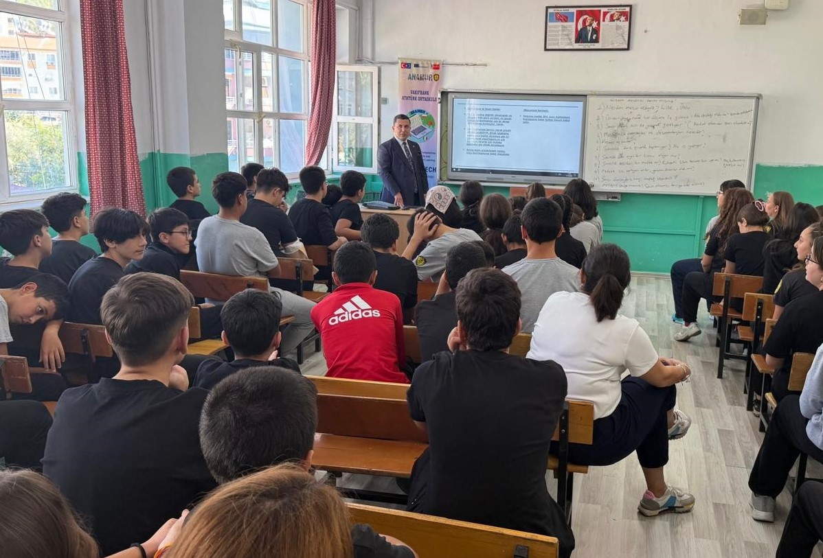 Öğrencilerle buluşan Mersin’in Anamur Cumhuriyet Başsavcısı Tanju Çatlı," Savcılık bir meslek değil, bir vicdan yolculuğudur. Biz, adaletin terazisini tutan elleriz. Sizler de büyüdüğünüzde hangi mesleği seçerseniz seçin, adil olun, dürüst olun, vicdanınızla yaşayın" dedi.
