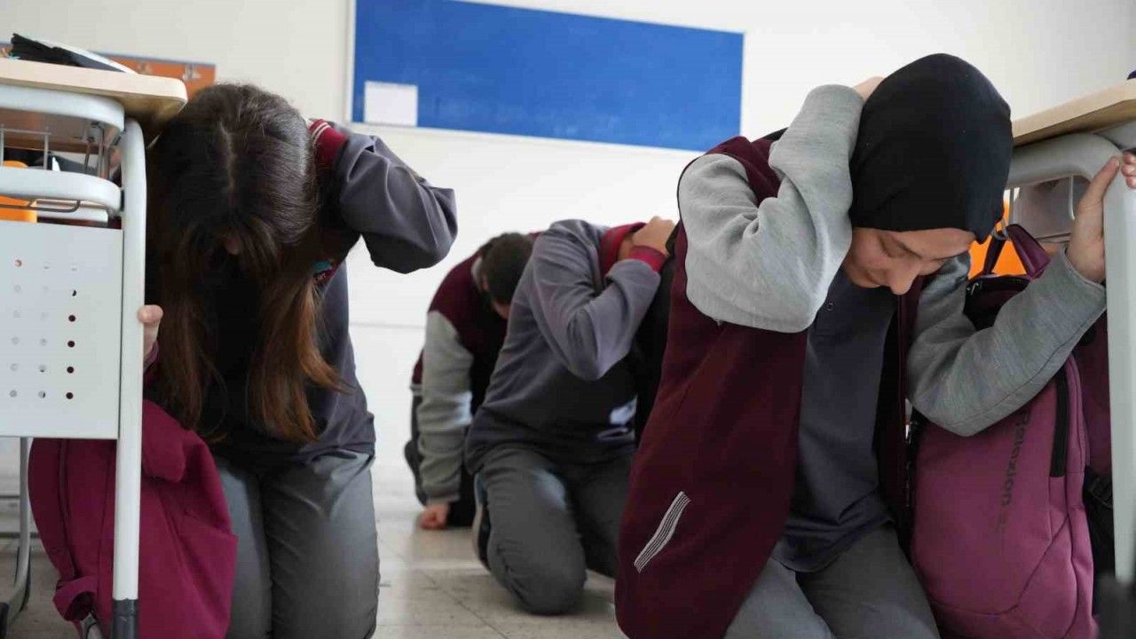 Deprem bilincinin artırılması ve öğrencilerde afet farkındalığının oluşturulması amacıyla düzenlenen tatbikatta, AFAD ve MEM AKUB ekipleri tarafından öğrencilere deprem sırasında ve sonrasında yapılması gerekenler anlatılarak, çök-kapan-tutun hareketi uygulamalı olarak gösterildi.