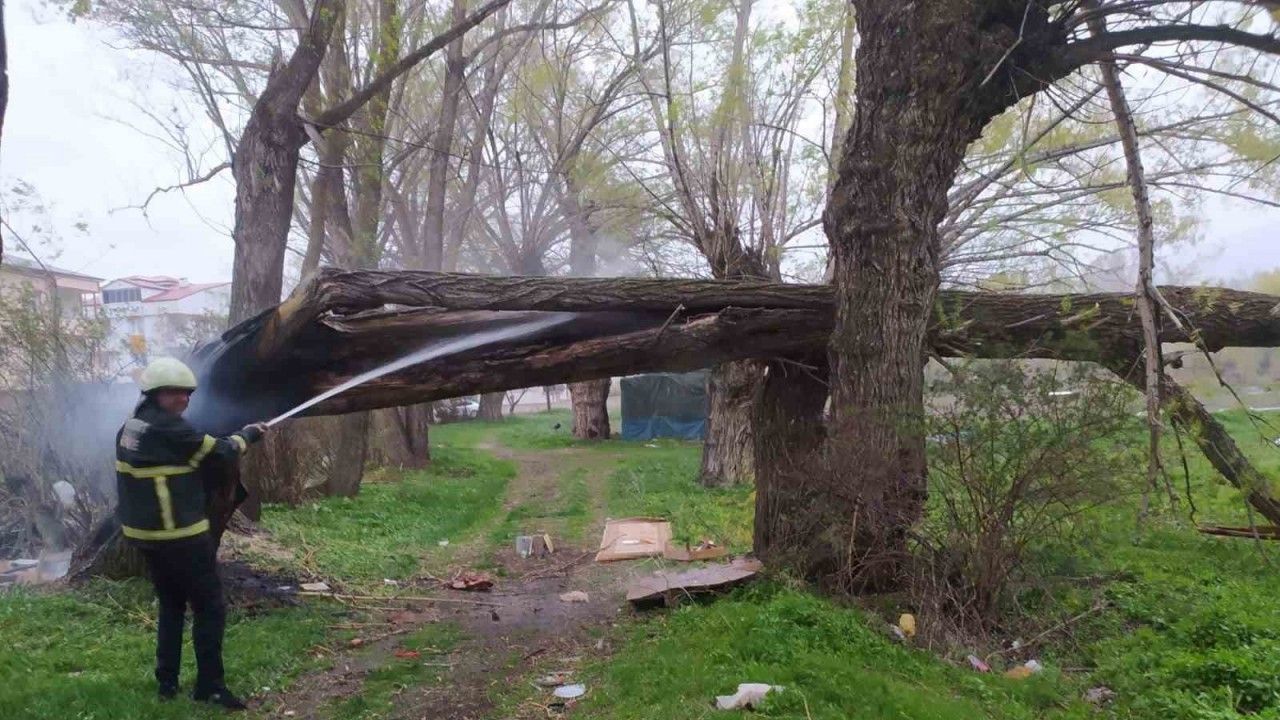 Gök gürültülü sağanak yağışın etili olduğu Bayburt’ta, Gençosman Mahallesi’nde bulunan bir ağaca yıldırım isabet etti. Yıldırımın şiddetiyle ikiye bölünen ağaç, daha sonra yanmaya başladı. Büyük bir ses ve gürültü duyan, ne olduğunu anlamaya çalışan vatandaşlar, pencerelere koşunca ağacın yandığını gördüler. Vatandaşların ihbarı üzerine olay yerine gelen itfaiye ekipleri, yanan ağaca müdahale ederek, yangını söndürdü. Şans eseri oradan birinin geçmemesi olası facianın önüne geçerken, mahalle sakinleri büyük bir patlama sesi duyduklarını, sesten dolayı korktuklarını söyledi.