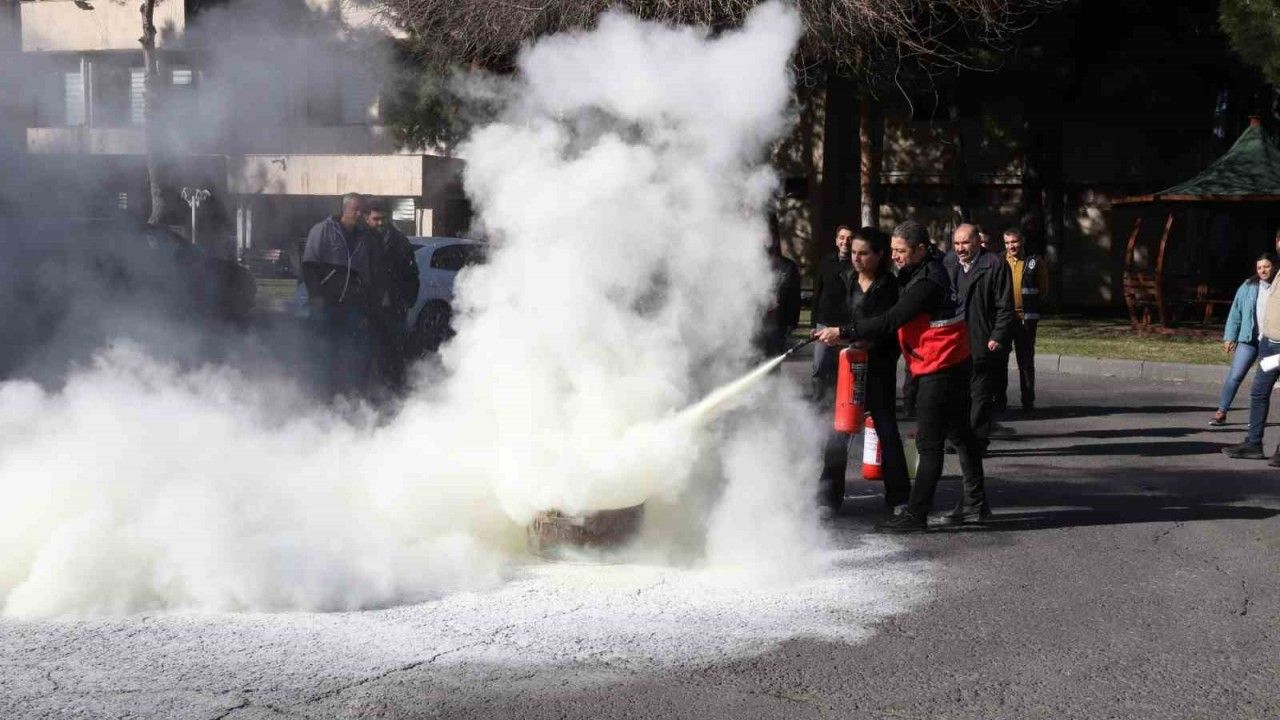 Personelin acil durumlara daha hazırlıklı hale gelmesi ve hızlı, doğru müdahalelerde bulunabilme yeteneğinin kazanması amaçlanan eğitimde, Büyükşehir Belediyesi İtfaiye Daire Başkanlığı Eğitim Şube Amiri ve İş Güvenliği Uzmanı Hasan Uğurlu tarafından yangın güvenliği ve müdahale teknikleri anlatıldı. Katılımcılar, eğitimin ardından belediye bahçesinde gerçekleştirilen yangın söndürme uygulamasıyla öğrendiklerini pratikte test etme imkanı buldu.