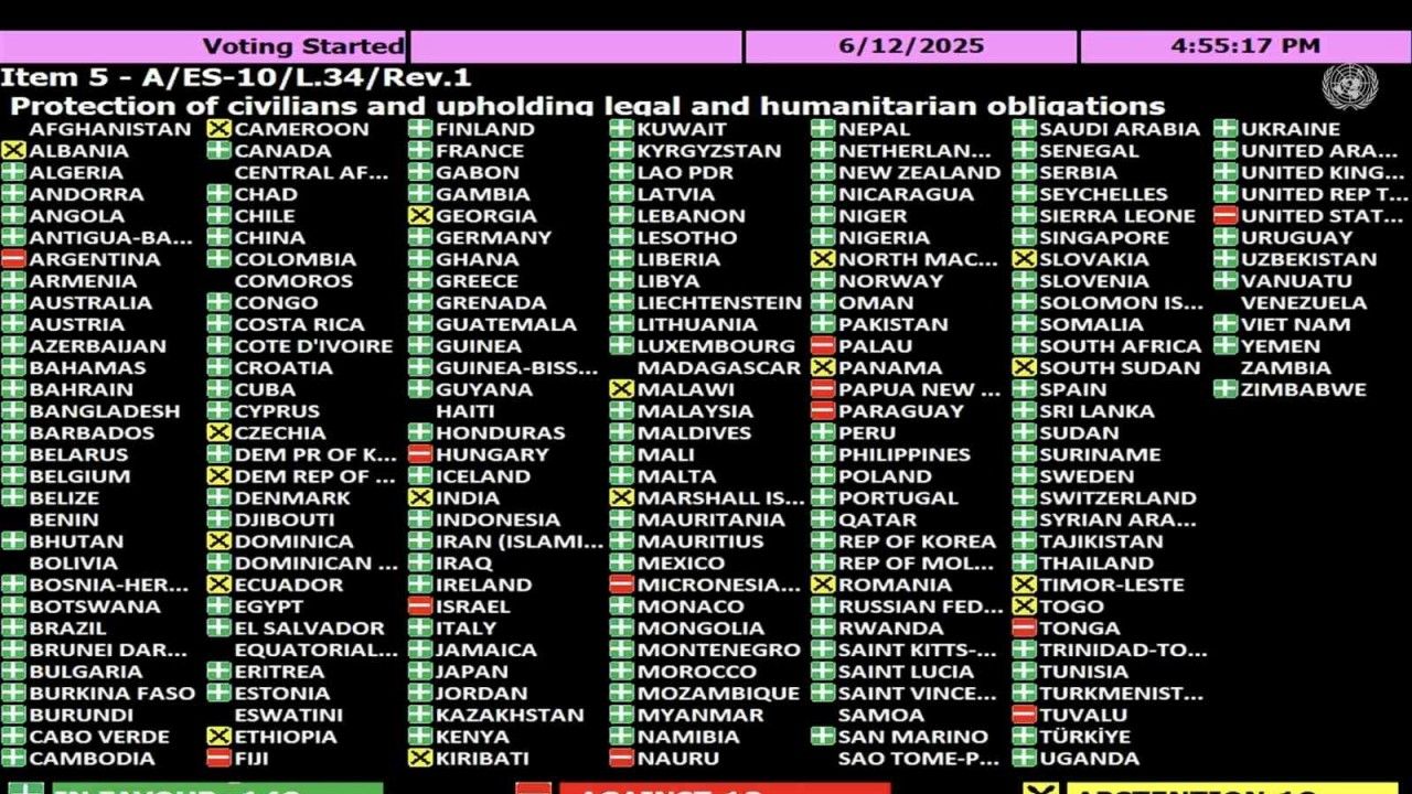 Gazze’de ateşkes talep eden, açlığın bir silah olarak kullanılmasını şiddetle kınayan ve İsrail’e insani yardımlara yönelik ablukayı kaldırma çağrısı yapan karar tasarısı, BM Genel Kurulu’nda 149 lehte, 12 aleyhte ve 19 çekimser oyla kabul edildi.