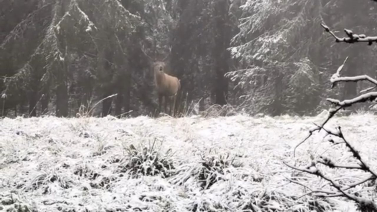 Bolu’nun karla kaplı ormanlarında karların arasından yavaş adımlarla ilerlerleyen kızılgeyik böğürme anlarıyla vatandaş kamerasına yansıdı.
