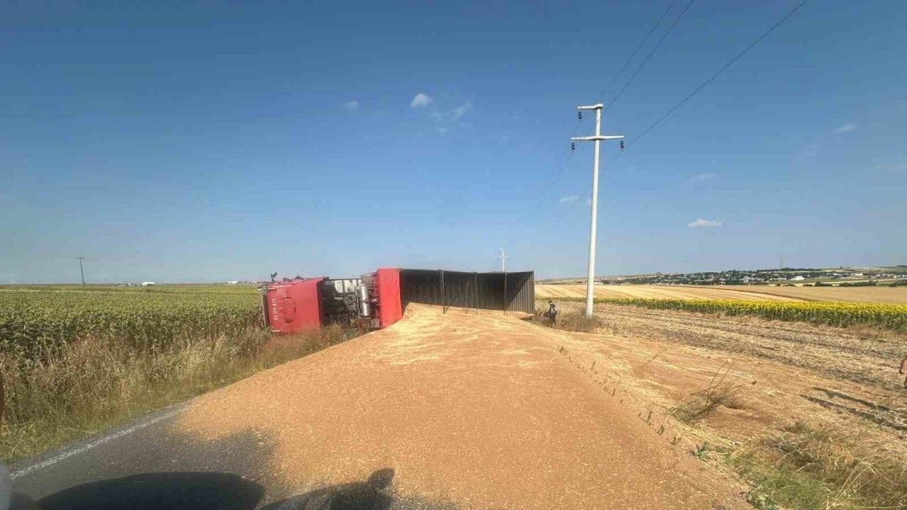 Tekirdağ’ın Muratlı ilçesinde buğday yüklü kamyonun devrildiği kazada sürücü yaralandı.