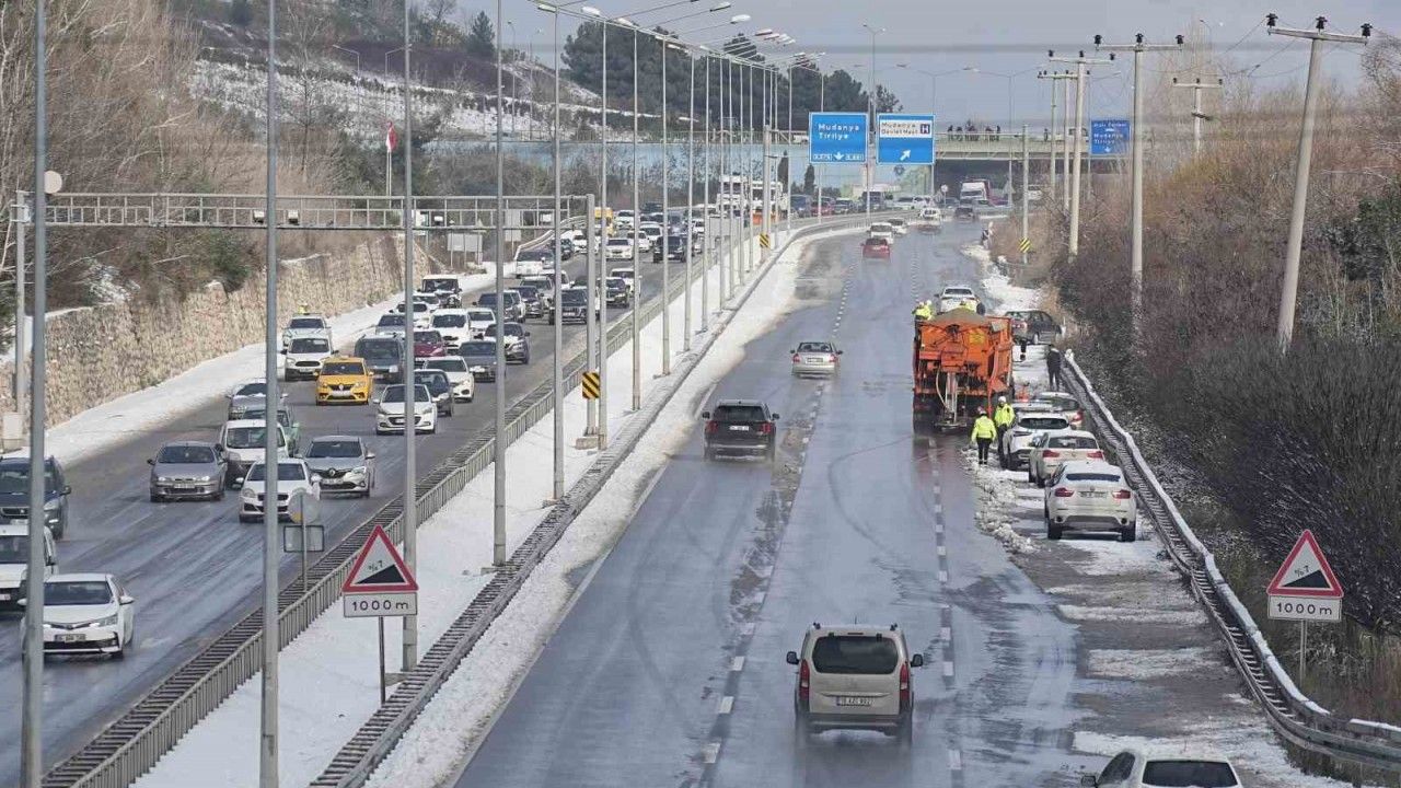 Bursa’da kar yağışı ulaşımı olumsuz etkiledi. Kardan kapanan Mudanya yolu ekiplerin çalışmasıyla yeniden trafiğe açıldı.