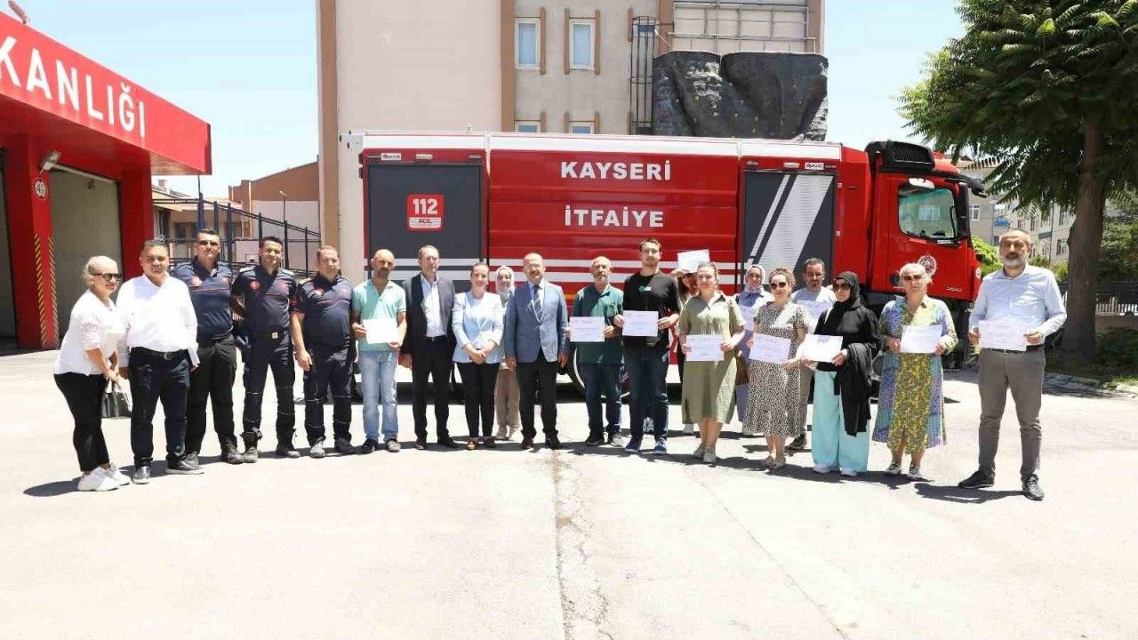 Kayseri Büyükşehir Belediyesi Afet İşleri Daire Başkanlığı tarafından afet ve acil durumlara karşı toplumun bilinçlenmesi ve müdahale kapasitesinin arttırılması amacıyla başlatılan eğitim programlarını tamamlayan kursiyerlere katılım belgeleri takdim edildi.