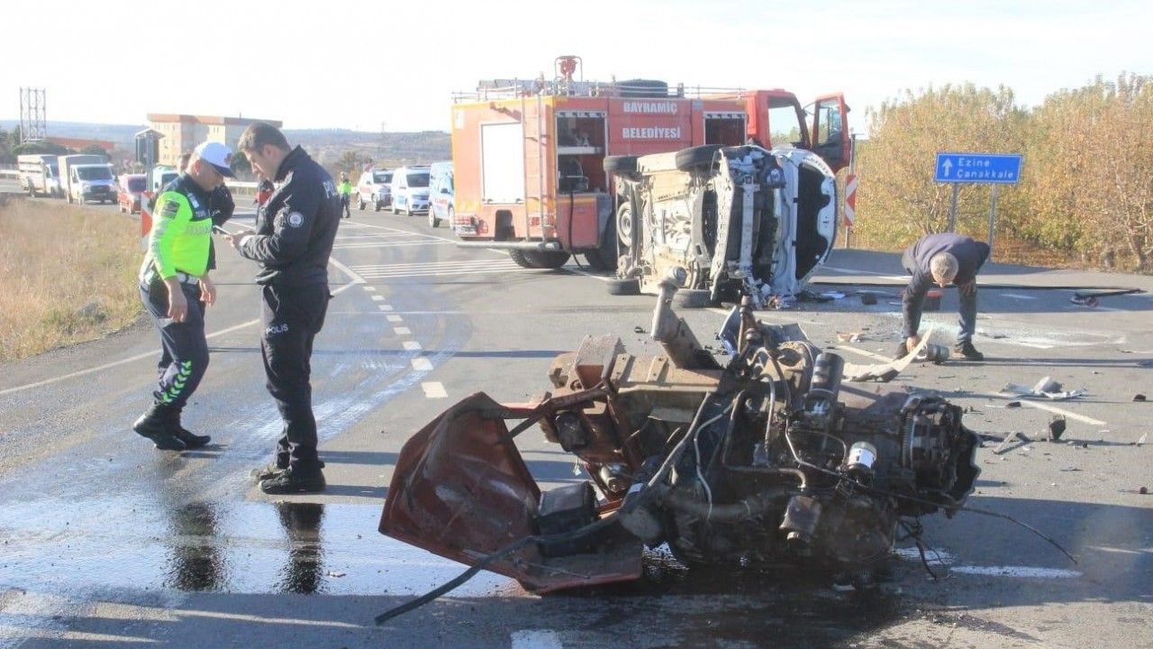 Çanakkale’nin Bayramiç ilçesinde hafif ticari araç ile traktör çarpıştı. Kazada traktör ikiye bölündü. 2 kişi yaralandı.