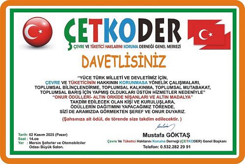 Çevre ve Tüketici Haklarını Koruma Derneği (ÇETKODER) tarafından çevre, tüketici hakları ve toplumsal bilinç konularında önemli çalışmalar yapan kişi ve kurumlara “Onur Ödülleri” verilecek.