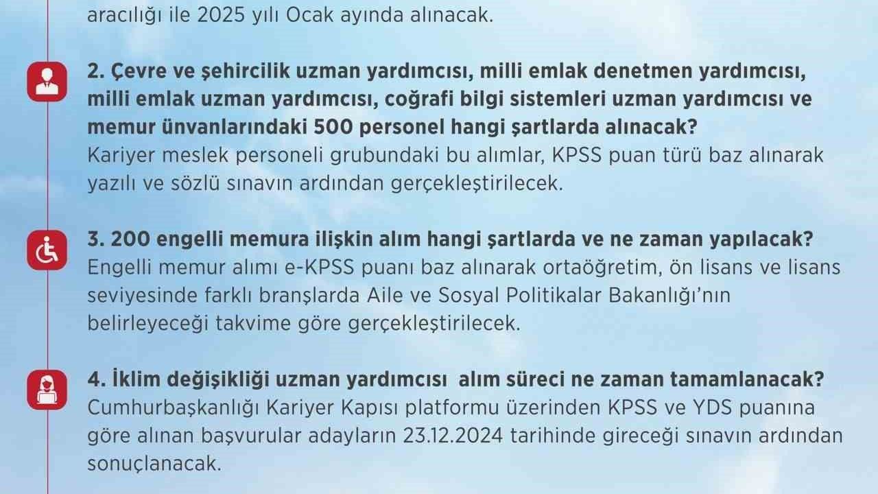 İklim değişikliği uzman yardımcısı alımı için Cumhurbaşkanlığı Kariyer Kapısı platformu üzerinden KPSS ve YDS puanına göre başvuruların yapılacağı, adayların 23 Aralık’ta gireceği sınavın ardından alınacak kişilerin belirleneceği ifade edildi. İŞKUR İşgücü Uyum Programı (İUP) kapsamında alınacak bin 500 kişinin 2025 yılı Ocak ayında göreve başlayacağı, Bakanlığın merkez ve taşra teşkilatındaki hizmet binalarının temizlik, bakım ve onarım faaliyetlerini destekleme kapsamında istihdam edileceği belirtildi.