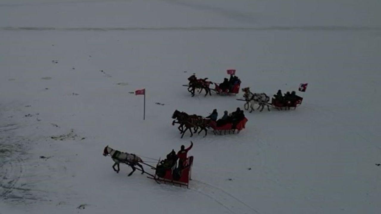 Dondurucu soğuk nedeniyle yüzeyi tamamen buzla kaplanan Çıldır Gölü’ne gelen turistler atlı kızakla geziyor.