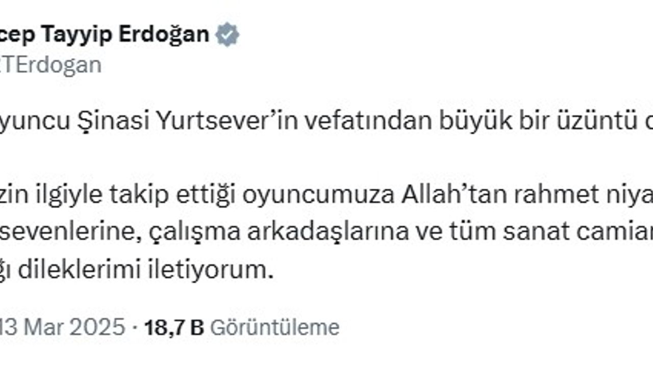 Cumhurbaşkanı Recep Tayyip Erdoğan, hayatını kaybeden Oyuncu Şinasi Yurtseven için sosyal medya hesabından taziye mesajı paylaştı. Erdoğan mesajında, "Değerli oyuncu Şinasi Yurtsever’in vefatından büyük bir üzüntü duydum. Milletimizin ilgiyle takip ettiği oyuncumuza Allah’tan rahmet niyaz ediyor; ailesine, sevenlerine, çalışma arkadaşlarına ve tüm sanat camiamıza başsağlığı dileklerimi iletiyorum" dedi.