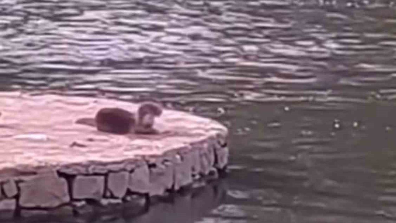 Diyarbakır’da Dicle Nehri kıyısında nadir görülen bir su samuru ve yavrusu, güneşlenirken bir vatandaşın cep telefonu kamerasına yansıdı.