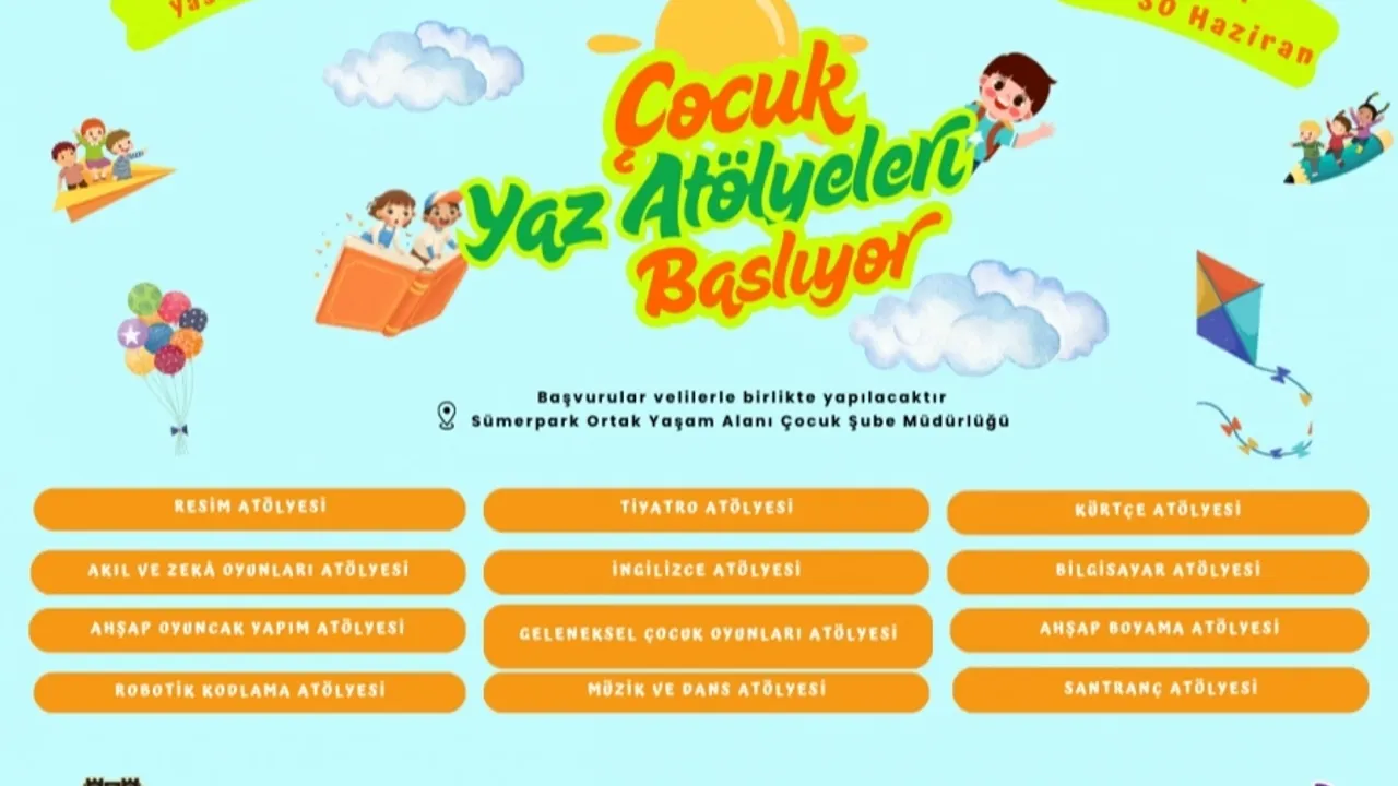 Diyarbakır Büyükşehir Belediyesi, yaz döneminde 9-14 yaş arası çocuklar için 12 ayrı dalda ücretsiz çocuk atölyeleri düzenliyor.DİYARBAKIR (İGFA) - Diyarbakır Büyükşehir Belediyesi Sosyal Hizmetler Dairesi Başkanlığı çocukların gelişimini artırmak ve sanatla buluşmalarını sağlamak amacıyla 12 ayrı dalda ücretsiz çocuk atölyeleri düzenleyecek.