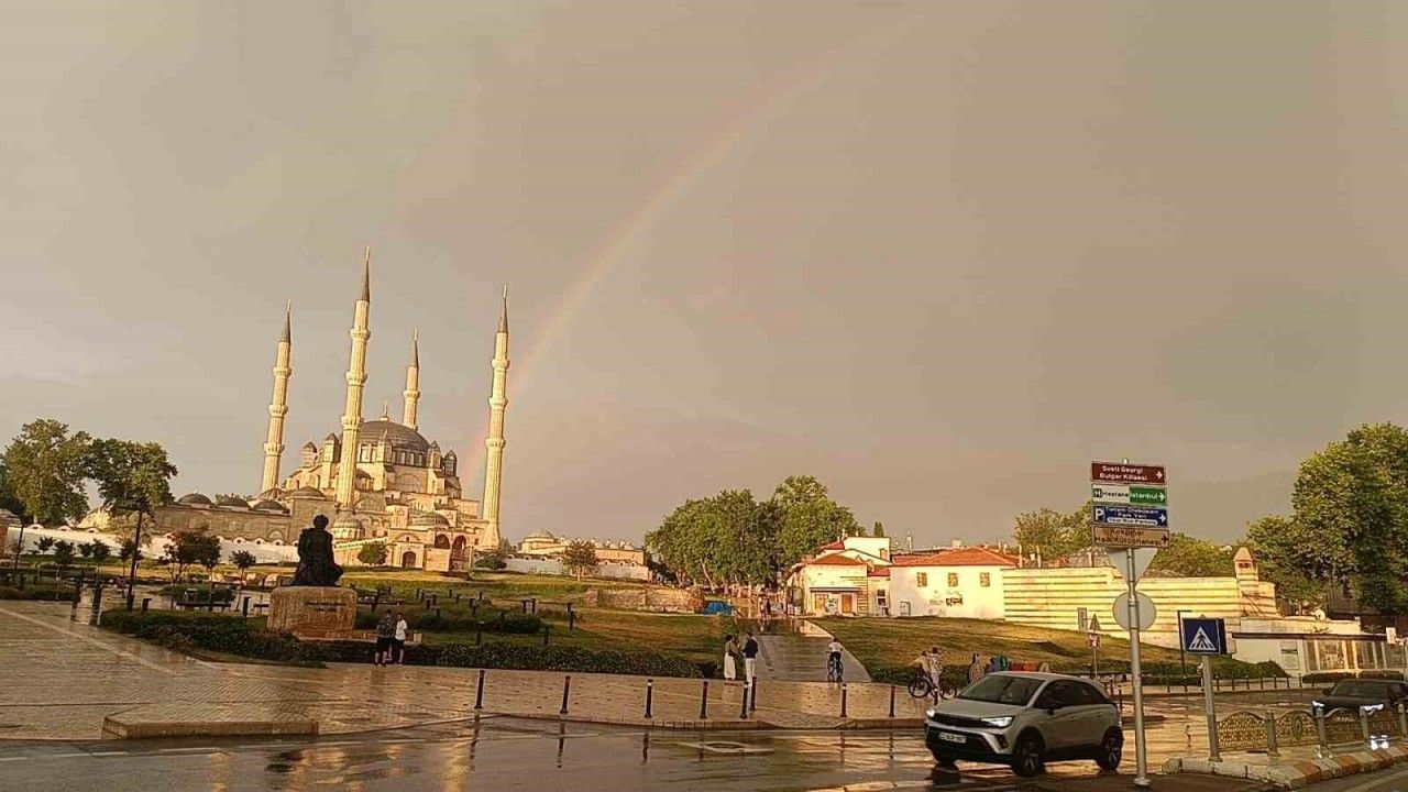 Edirne’de kısa süreli sağanak yağışın ardından oluşan gökkuşağı, kentte adeta görsel şölen oluşturdu. Özellikle Selimiye Camii’nin arkasında beliren gökkuşağı, hem kent sakinlerinin hem de turistlerin ilgisini çekti.