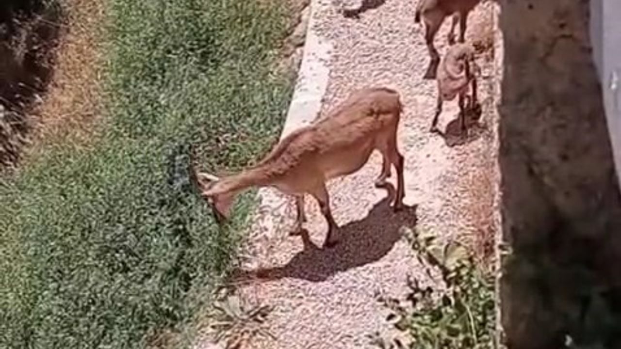 Elazığ’da nesli tehdit altındaki anne ve yavru dağ keçileri, tarihi Harput Mahallesi’nde yiyecek ararken görüntülendi.