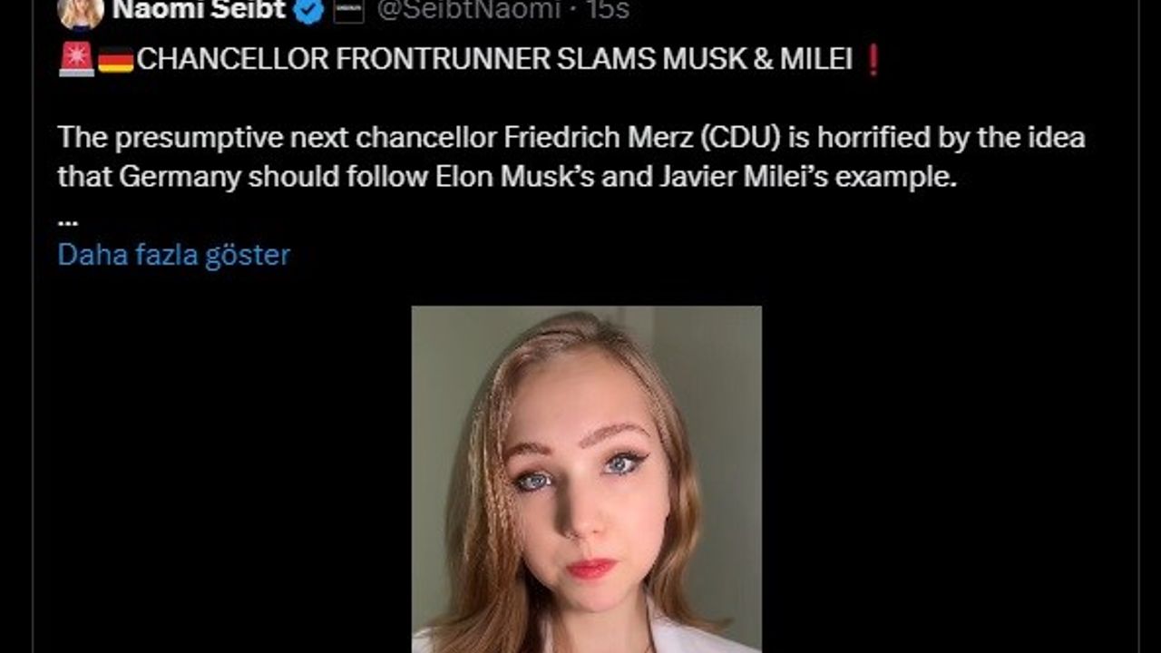 ABD’de yapılan başkanlık seçiminde Cumhuriyetçi aday Donald Trump’ı destekleyen milyarder iş insanı Elon Musk, bu kez Almanya siyasetine ilişkin paylaşım yaptı. Musk, X sosyal medya platformunda Alman sağcı Naomi Seibet’in anketlerde açık ara önde görünen muhafazakarların başbakan adayı Friedrich Merz’i eleştiren mesajını yeniden paylaşarak, "Almanya’yı yalnızca AfD kurtarabilir" ifadelerini kullandı. Alman hükümeti, Musk’ın paylaşımını not aldıklarını belirtti.