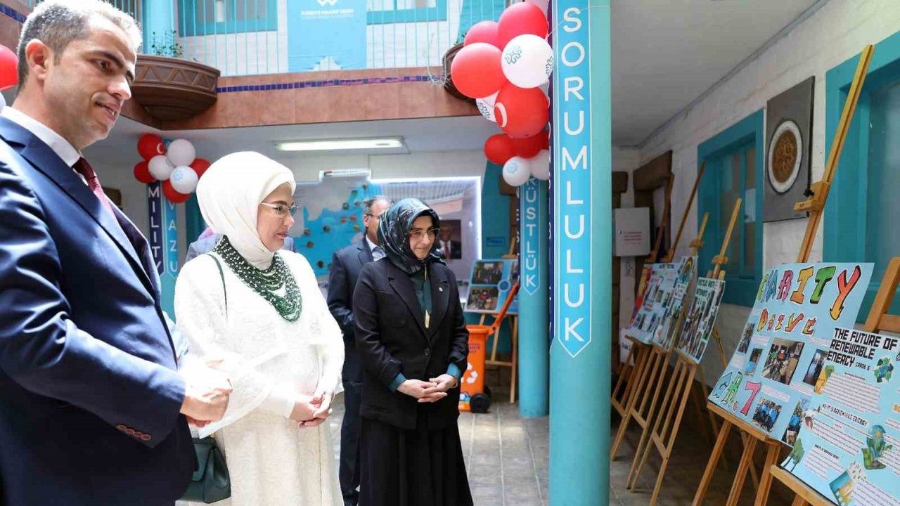 "Geri Dönüşüm ve Çevre" temalı sergiyi gezen Emine Erdoğan, buradaki çalışmalar hakkında öğrenci ve öğretmenlerden bilgi aldı.