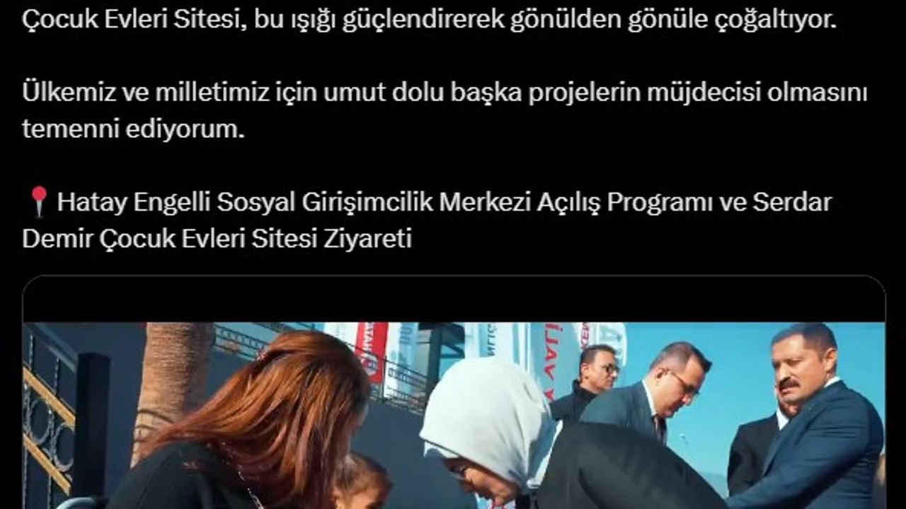 Emine Erdoğan, sosyal medya hesabından yaptığı paylaşımda, "İnsana dokunan her iyilik, yarının en parlak ışığıdır. Hatay’da hayat bulan Engelli Sosyal Girişimcilik Merkezi ve Serdar Demir Çocuk Evleri Sitesi, bu ışığı güçlendirerek gönülden gönüle çoğaltıyor. Ülkemiz ve milletimiz için umut dolu başka projelerin müjdecisi olmasını temenni ediyorum" dedi.
