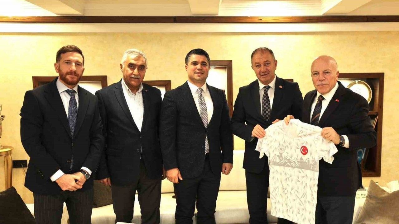 Erzurum Gençlik ve Spor İl Müdürü Levent Çakmur ile Spor Hizmetleri Müdürü Erdoğan Dönmez, Uluslararası Kandilli Kayak Merkezinde pistlerinde asfalt ve çevre düzenlemesi yapan Büyükşehir Belediye Başkanı Mehmet Sekmen’e ‘Erzurum forması’ vererek teşekkür etti.