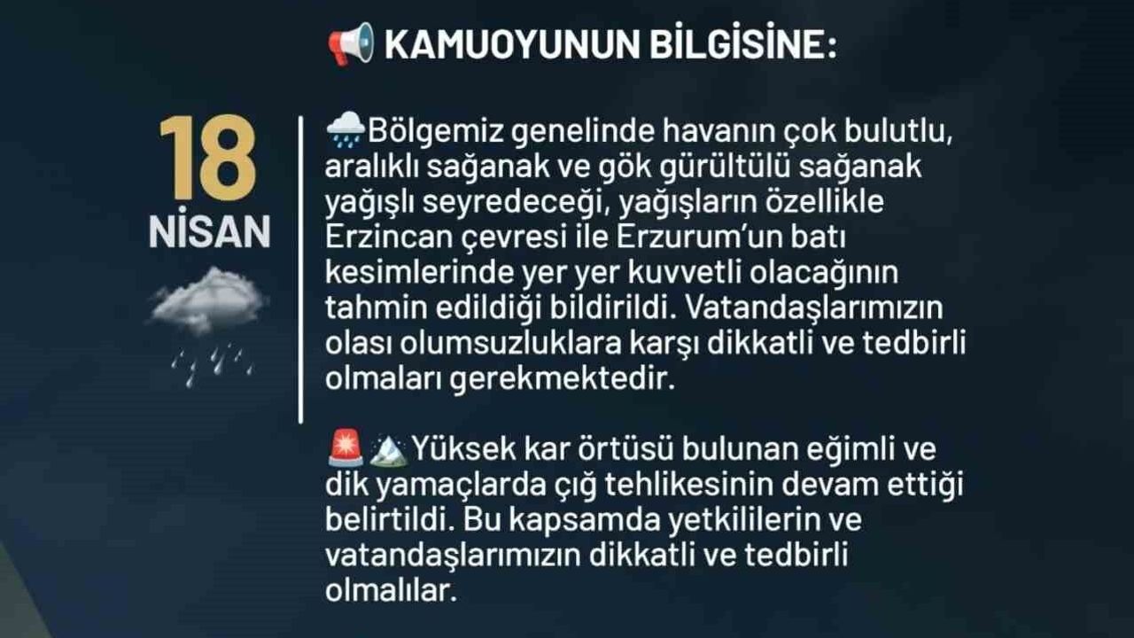 Bölge genelinde havanın çok bulutlu, aralıklı sağanak ve gök gürültülü sağanak yağışlı seyredeceği, yağışların özellikle Erzincan çevresi ile Erzurum'un batı kesimlerinde yer yer kuvvetli olacağının tahmin edildiği bildirildi. Yapılan açıklamada, daha sonra şöyle denildi, 'Yüksek kar örtüsü bulunan eğimli ve dik yamaçlarda çığ tehlikesinin devam ettiği belirtildi. Bu kapsamda yetkililerin ve vatandaşlarımızın dikkatli ve tedbirli olmalılar'