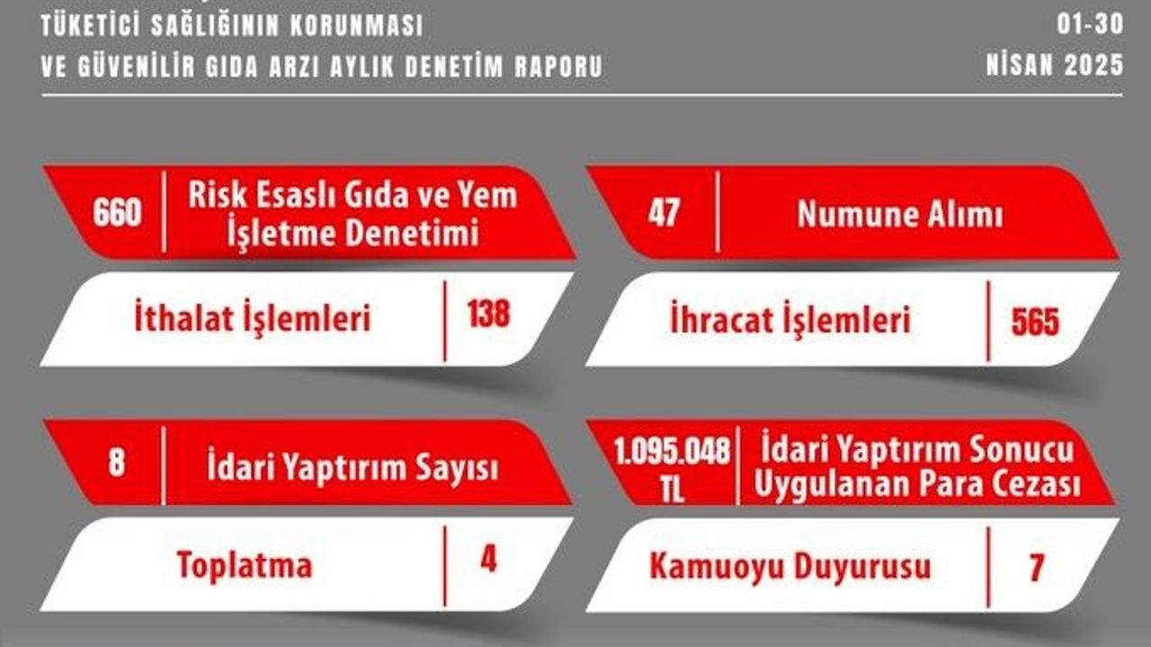 Eskişehir İl Tarım ve Orman Müdürlüğü Gıda ve Yem Şube Müdürlüğü tarafından 1-30 Nisan tarihlerinde denetimler gerçekleştirildi. Tüketici Sağlığının Korunması ve Güvenilir Gıda Arzı Aylık Denetim Raporu kapsamında; 660 adet risk esaslı gıda ve yem işletme denetimi, 138 adet ithalat işlemleri, 565 adet ihracat işlemleri, 47 adet numune alımı yapıldı. Denetimler çerçevesinde ayrıca 8 adet idari yaptırım, 4 adet toplatma, 1 faaliyet durdurma, 3 imha kararı ve 7 kamuoyu duyurusu gerçekleştirildi. İdari yaptırımlar sonucu işletmelere toplam 1 milyon 95 bin 48 TL para cezası uygulandı.