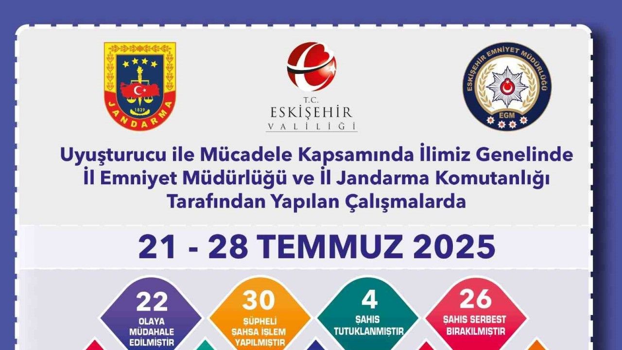 Eskişehir İl Emniyet Müdürlüğü ile İl Jandarma Komutanlığı ekipleri, 21-28 Temmuz 2025 tarihleri arasında uyuşturucuyla mücadele kapsamında yürüttükleri çalışmalarda önemli sonuçlar elde etti.