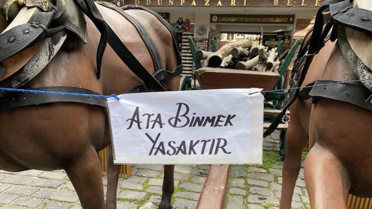 Eskişehir’de Atlıhan El Sanatları Çarşısı’nda bulunan at heykellerinin üzerine asılmış "Ata binmek yasaktır" şeklindeki ilginç uyarı yazısı vatandaşların dikkatini çekerken, ilginç görüntüler ortaya çıkarıyor.